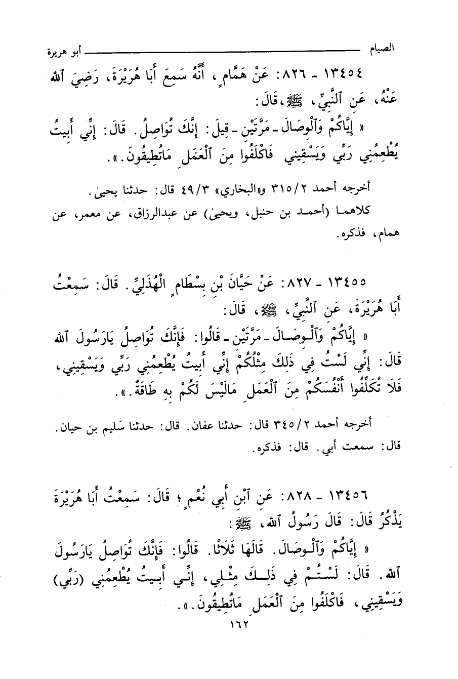 إِيَّاكُمْ وَالْوِصَالَ، مَرَّتَيْنِ، قَالُوا: فَإِنَّكَ تُوَاصِلُ يَا رَسُولَ اللهِ، قَالَ: إِنِّي لَسْتُ فِي ذَلِكَ مِثْلَكُمْ، إِنِّي أَبِيتُ يُطْعِمُنِي رَبِّي وَيَسْقِينِي، فَلَا تُكَلِّفُوا أَنْفُسَكُمْ مِنَ الْعَمَلِ مَا لَيْسَ لَكُمْ بِهِ طَاقَةٌ.