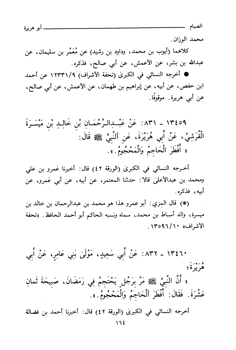- أخرجه النسائي في "الكبرى" ٣١٦٥ قال: أخبرنا أحمد بن حَفْص بن عَبد الله، نيسابوري مرجئ، قال: حدثني أبي، قال: حدثني إبراهيم بن طهمان، هروي مرجئ، عن الأَعمش، عن أبي صالح، عن أبي هُرَيرة، قال: