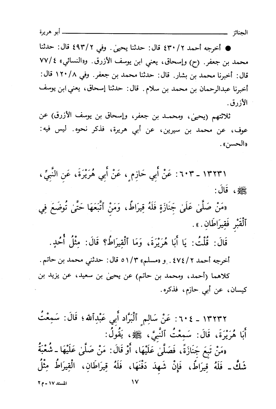 - وفي رواية: مَنْ تَبِعَ جَنَازَةَ رَجُلٍ مُسْلِمٍ احْتِسَابًا، فَصَلَّى عَلَيْهَا وَدَفَنَهَا، فَلَهُ قِيرَاطَانِ، وَمَنْ صَلَّى عَلَيْهَا ثُمَّ رَجَعَ قَبْلَ أَنْ تُدْفَنَ، فَإِنَّهُ يَرْجِعُ بِقِيرَاطٍ مِنَ الأَجْرِ.