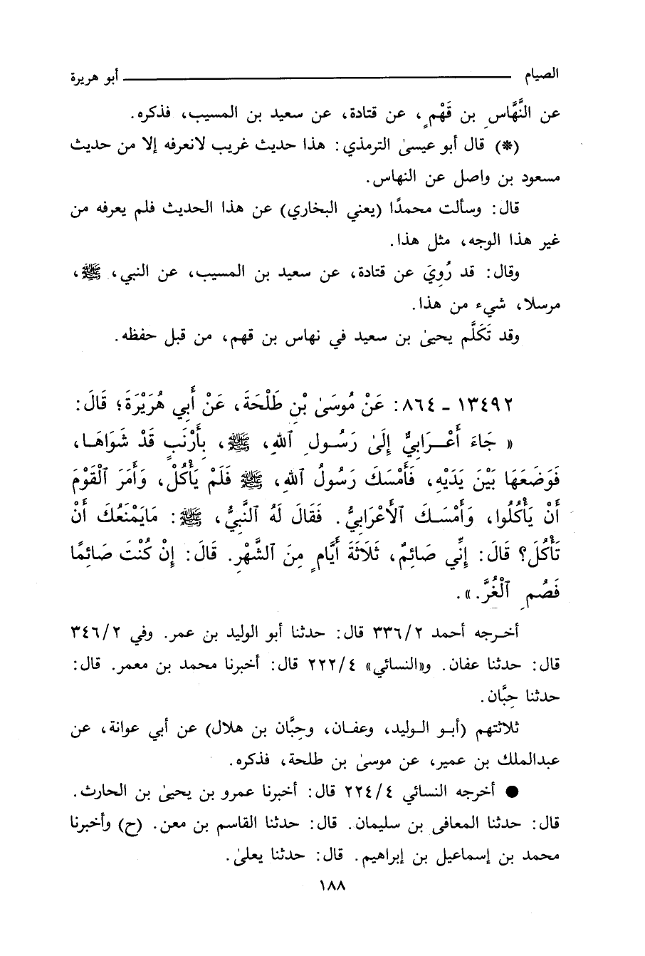 أَتَى أَعْرَابِيٌّ رَسُولَ اللهِ صلى الله عليه وسلم بِأَرْنَبٍ قَدْ شَوَاهَا، وَمَعَهَا صِنَابُهَا وَأَدُمَهَا، فَوَضَعَهَا بَيْنَ يَدَيْهِ، فَأَمْسَكَ رَسُولُ اللهِ صلى الله عليه وسلم فَلَمْ يَأْكُلْ، وَأَمَرَ أَصْحَابَهُ أَنْ يَأْكُلُوا، فَأَمْسَكَ الأَعْرَابِيُّ، فَقَالَ لَهُ رَسُولُ اللهِ صلى الله عليه وسلم: مَا يَمْنَعُكَ أَنْ تَأْكُلَ؟ قَالَ: إِنِّي أَصُومُ ثَلَاثَةَ أَيَّامٍ مِنْ كُلِّ شَهْرٍ، قَالَ: إِنْ كُنْتَ صَائِمًا فَصُمِ الأَيَّامَ الْغُرَّ.