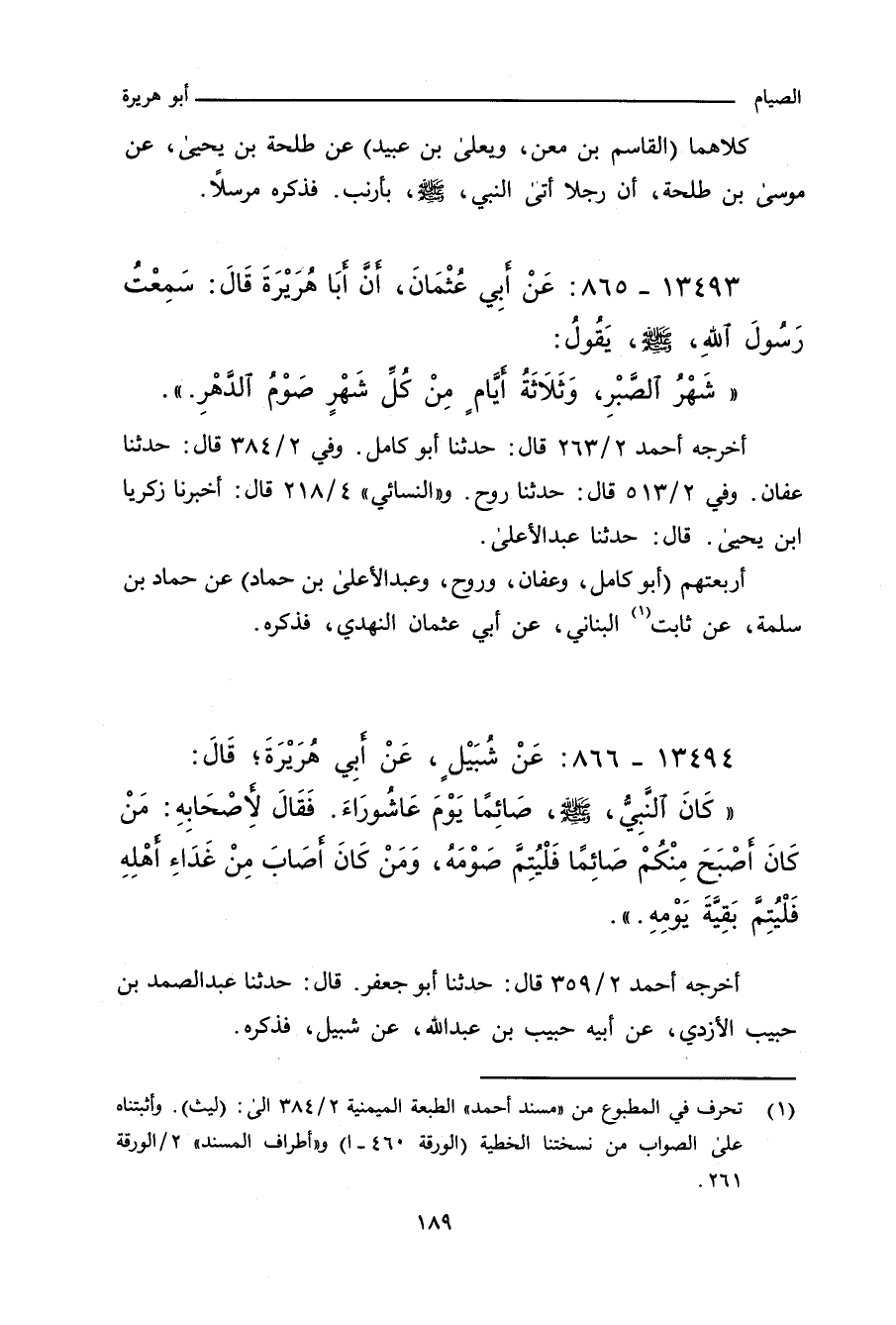 ١٣٤٩٣ - عَنْ أَبِي عُثْمَانَ النَّهْدِيِّ، أَنَّ أَبَا هُرَيْرَةَ قَالَ: سَمِعْتُ رَسُولَ اللهِ صلى الله عليه وسلم يَقُولُ: