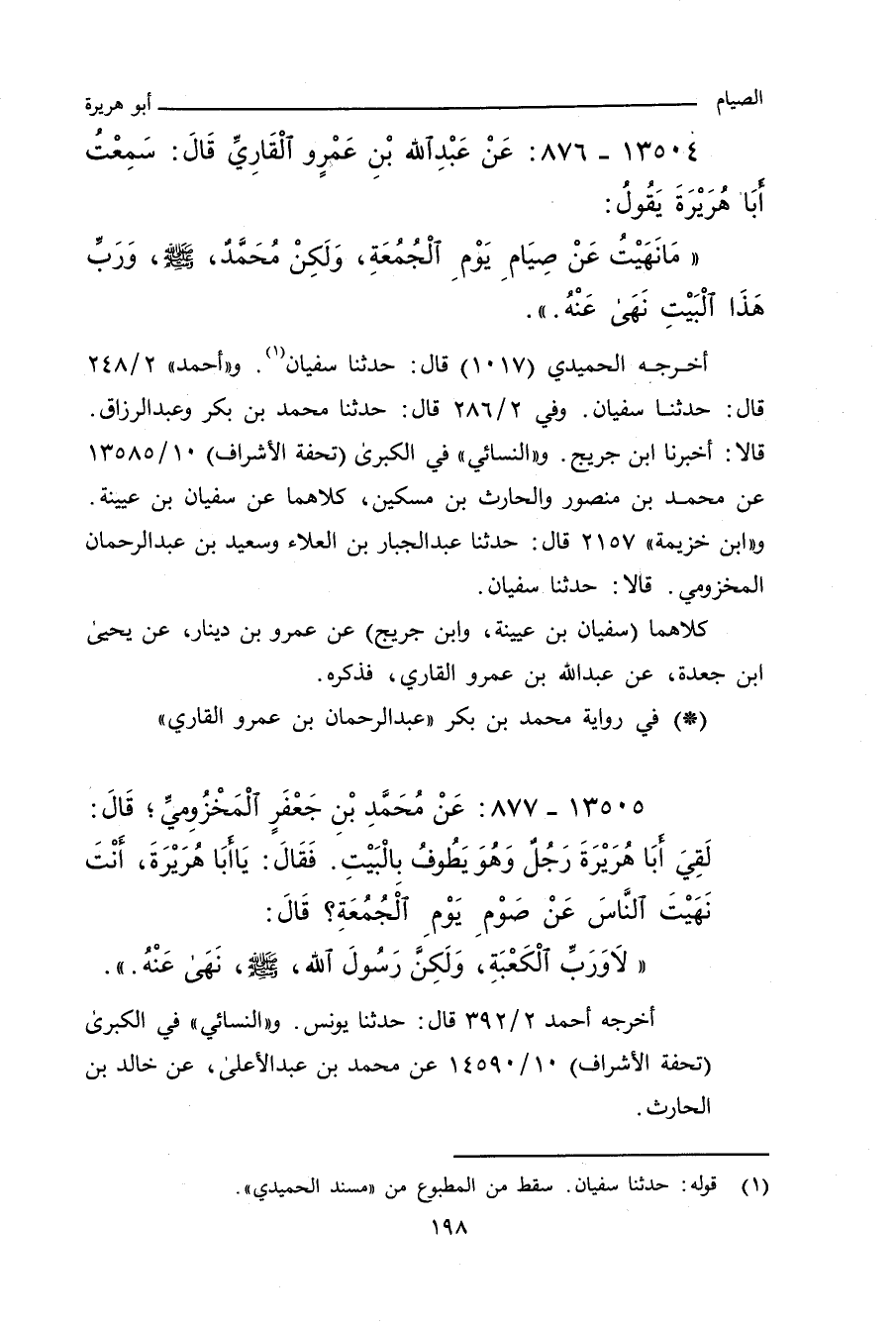 أخرجه الحميدي (١٠١٧) قَالَ: حدثنا سفيان. و"أحمد" ٢/ ٢٤٨ (٧٣٨٢) قَالَ: حدثنا سفيان. وفي ٢/ ٢٨٦ (٧٨٢٦) قَالَ: حدثنا محمد بن بكر وعبد الرزاق. قالا: أخبرنا ابن جُريج. و"النَّسائي" في الكبرى" تحفة الأشراف" ١٠/ ١٣٥٨٥، عن محمد بن منصور والحارث بن مسكين، كلاهما، عن سفيان بن عيينة. و (ابن خزيمة) ٢١٥٧ قَالَ: حدثنا عبد الجبار بن العلاء وسعيد بن عبد الرحمن المخزومي. قالا: حدثنا سفيان.