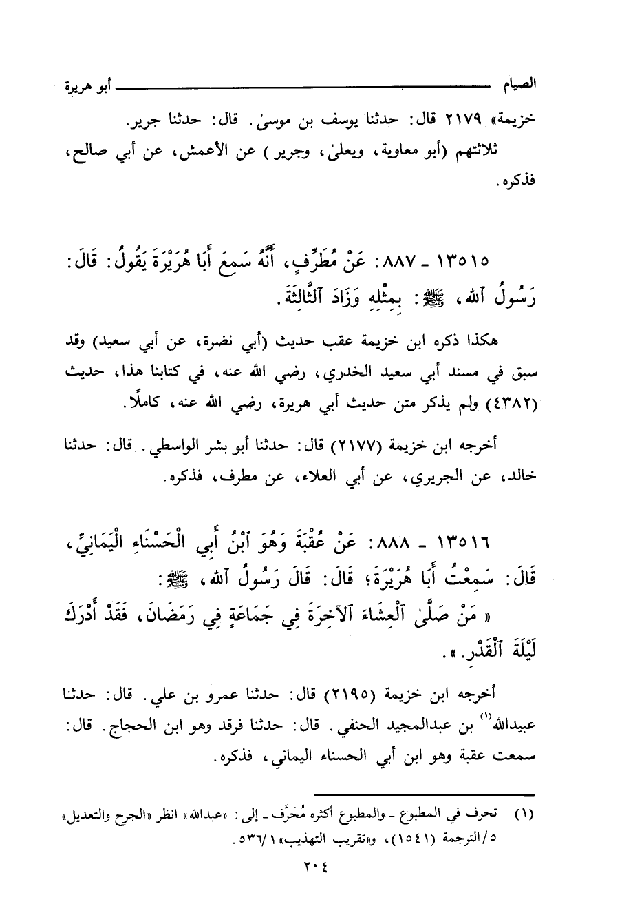 هكذا ذكره ابن خزيمة عقب حديث (أبي نضرة، عن أبي سعيد) وقد سبق في مسند أبي سعيد الخدري، رضي، عنه، عنه، في كتابنا هذا، حديث (٤٣٨٢) ولم يذكر متن حديث أبي هريرة، رضي الله، عنه، كاملا.