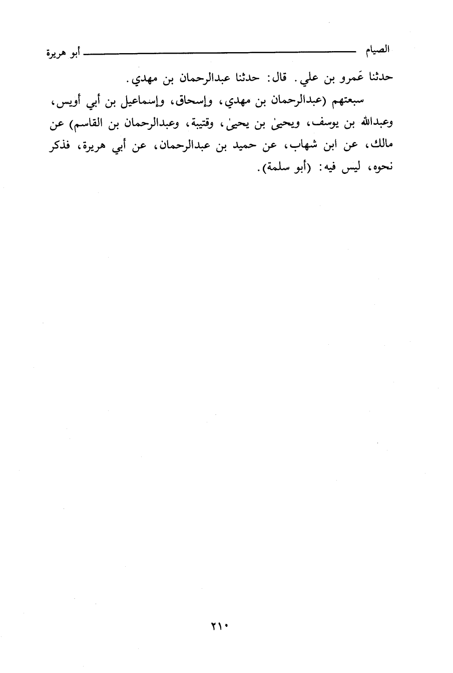 سبعتهم (عبد الرحمن بن مهدي، وإسحاق، وإسماعيل بن أبي أويس، وعبد الله بن يوسف، ويحيى بن يحيى، وقتيبة، وعبد الرحمن بن القاسم) عن مالك، عن ابن شهاب، عَنْ حُمَيْدِ بْنِ عَبْدِ الرَّحْمَانِ، عَنْ أَبِي هُرَيْرَةَ، أَنَّ رَسُولَ اللهِ صلى الله عليه وسلم قَالَ: