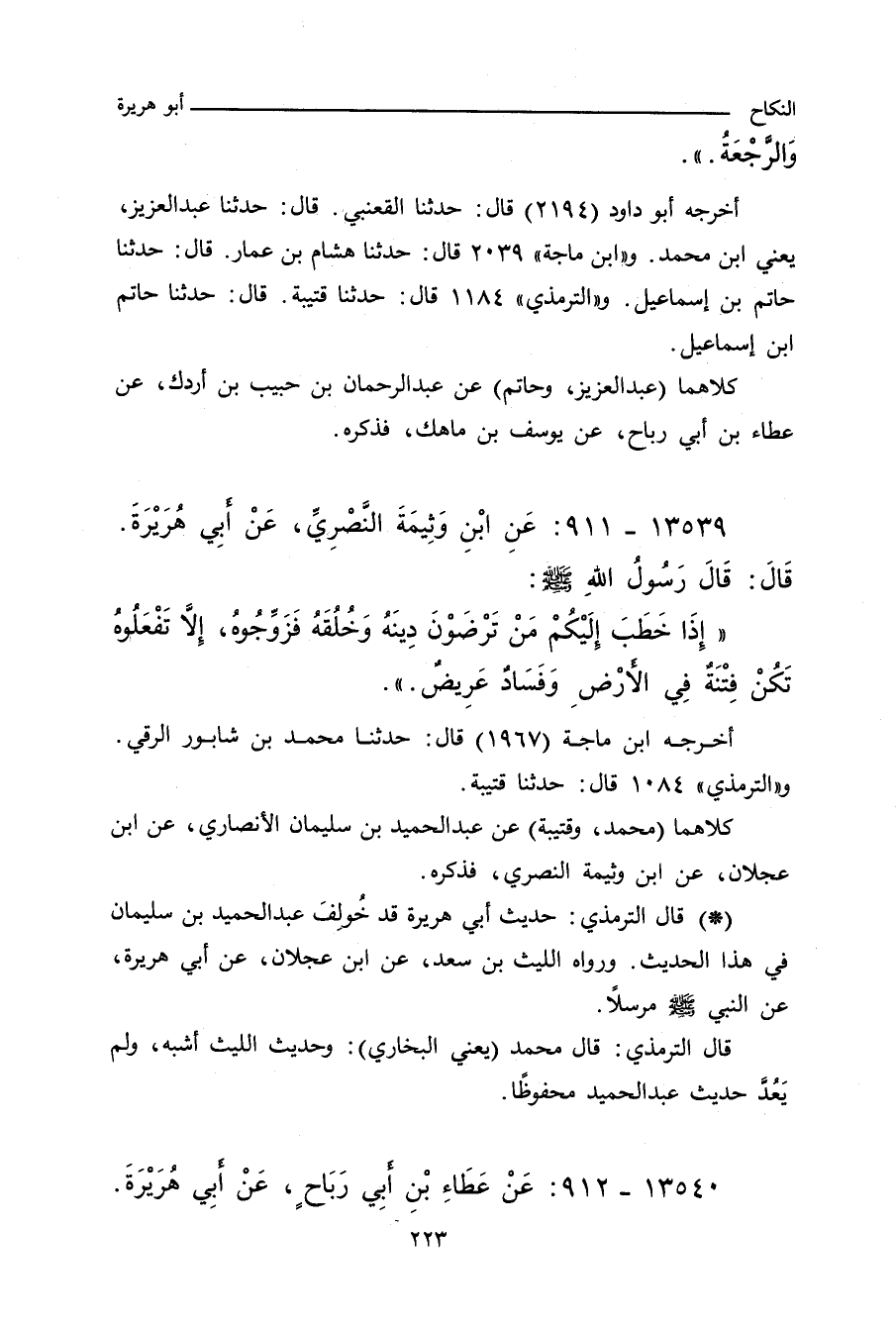 ـ لفظ التِّرمِذي: إِذَا خَطَبَ إِلَيْكُمْ مَنْ تَرْضَوْنَ دِينَهُ وَخُلُقَهُ فَزَوِّجُوهُ، إِلَاّ تَفْعَلُوا تَكُنْ فِتْنَةٌ فِي الأَرْضِ وَفَسَادٌ عَرِيضٌ.