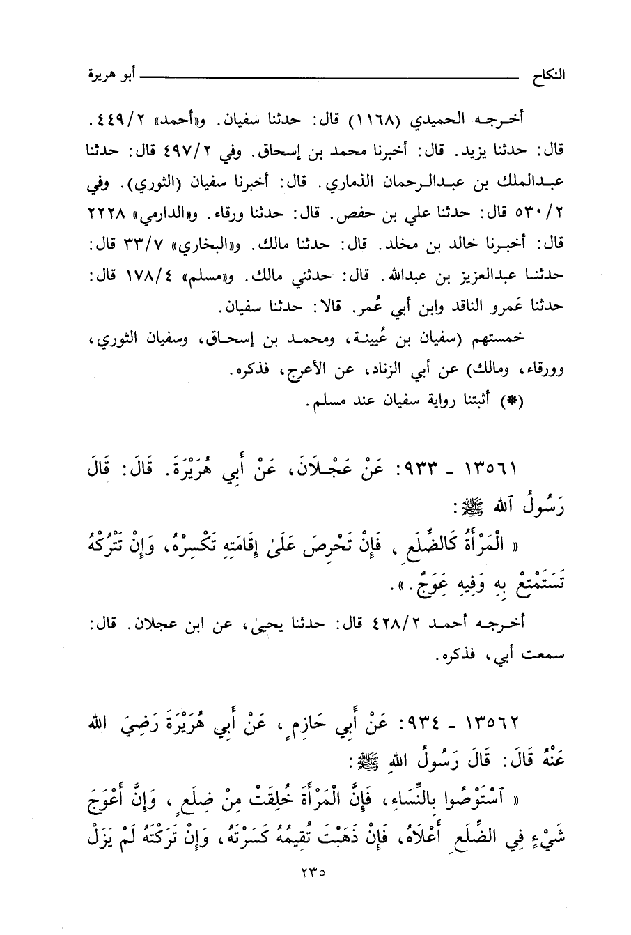 ـ لفظ عَبد الله بن رجاء: إِنَّمَا مَثَلُ الْمَرْأَةِ كَالضِّلَعِ، إِنْ أَرَدْتَ إِقَامَتَهَا كُسِرَتْ، وَإِنْ تَسْتَمْتِعْ بِهَا تَسْتَمْتِعْ بِهَا وَفِيهَا عِوَجٌ، فَاسْتَمْتِعْ بِهَا عَلَى مَا كَانَ مِنْهَا مِنْ عِوَجٍ.
