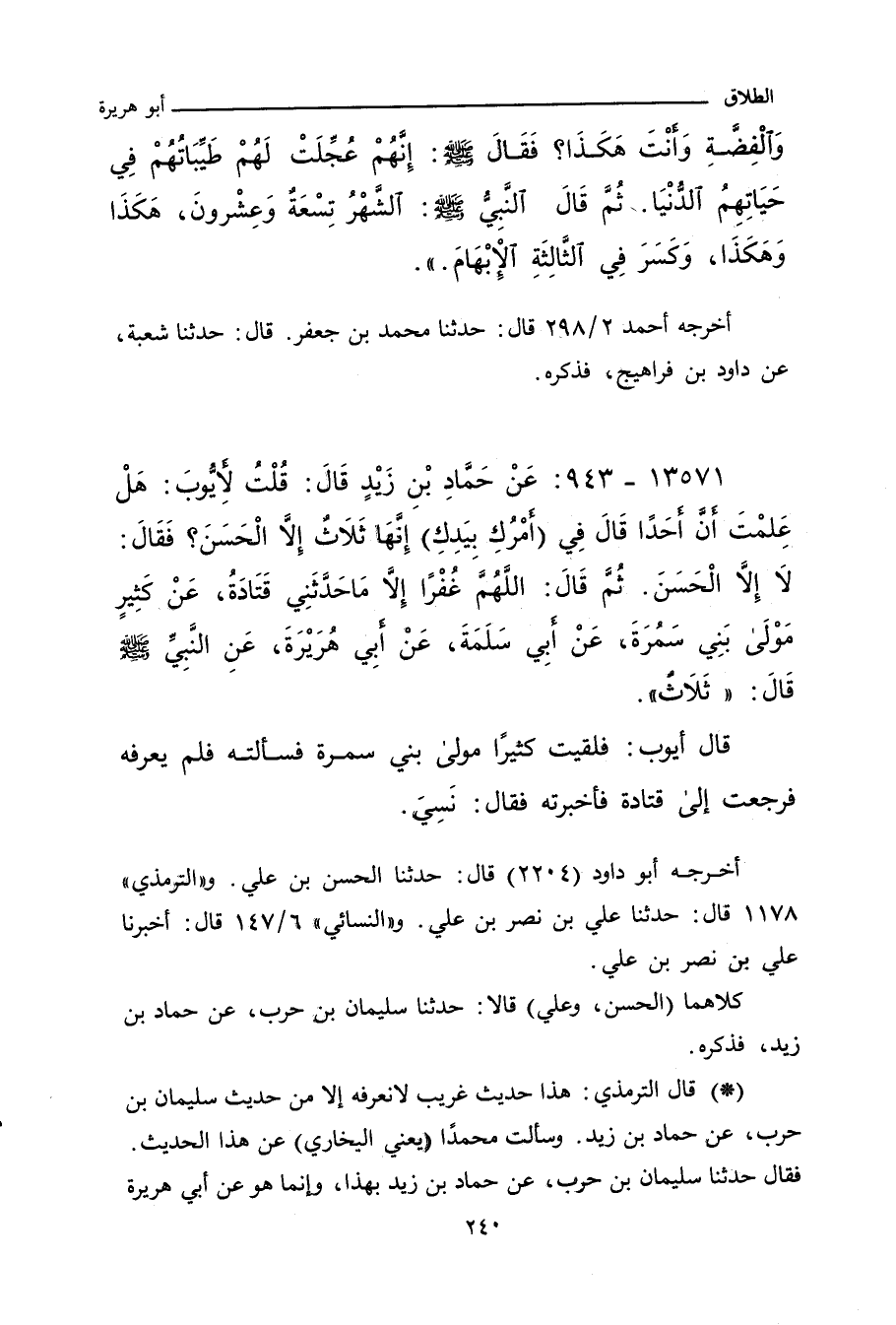 ـ قال أَبُو عِيسَى الترمذي: هذا حديثٌ غريبٌ لا نعرفه إلا من حديث سليمان بن حرب، عن حماد بن زيد، وسألت محمدًا عن هذا الحديث، فقال: حدثنا سليمان بن حرب، عن حماد بن زيد بهذا، وإنما هو عن أبي هُرَيْرة