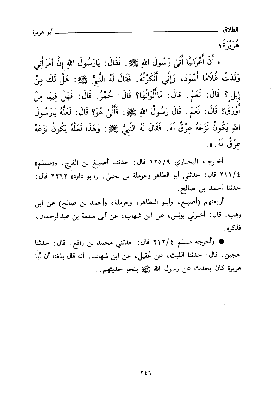 أَنَّ أَعْرَابِيًّا أَتَى رَسُولَ اللهِ صلى الله عليه وسلم، فَقَالَ: إِنَّ امْرَأَتِي وَلَدَتْ غُلَامًا أَسْوَدَ، وَإِنِّي أَنْكَرْتُهُ، فَقَالَ لَهُ رَسُولُ اللهِ صلى الله عليه وسلم: هَلْ لَكَ مِنْ إِبِلٍ؟ قَالَ: نَعَمْ، قَالَ: فَمَا أَلْوَانُهَا؟ قَالَ: حُمْرٌ، قَالَ: هَلْ فِيهَا مِنْ أَوْرَقَ؟ قَالَ: إِنَّ فِيهَا لَوُرْقًا، قَالَ: فَأَنَّى تُرَى ذَلِكَ جَاءَهَا؟ قَالَ: يَا رَسُولَ اللهِ، عِرْقٌ نَزَعَهَا، قَالَ: وَلَعَلَّ هَذَا عِرْقٌ نَزَعَهُ، وَلَمْ يُرَخِّصْ لَهُ فِي الاِنْتِفَاءِ مِنْهُ.
