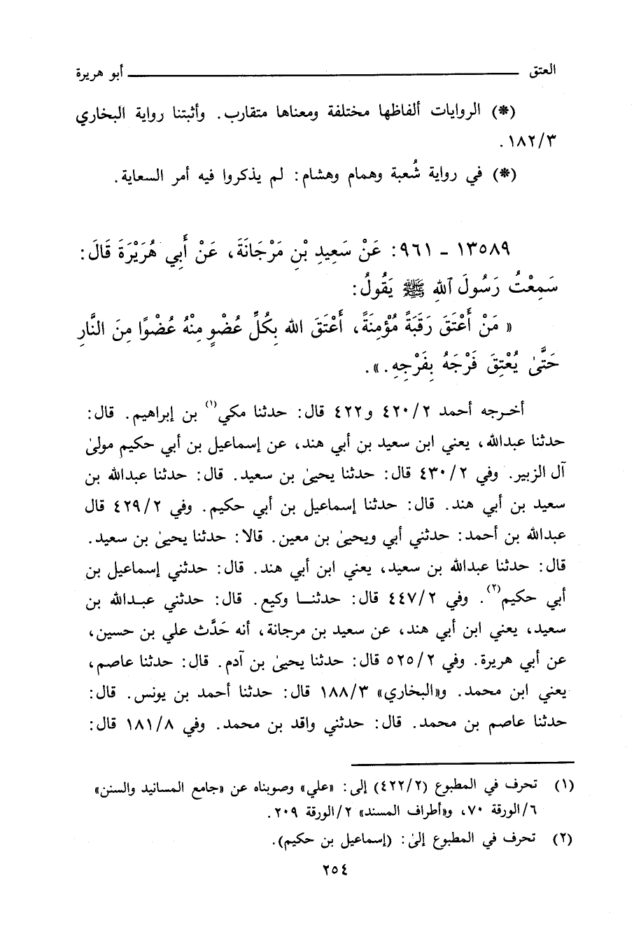 قَالَ: فَقَالَ عَلِيُّ بْنُ الْحُسَيْنِ: أَنْتَ سَمِعْتَ هَذَا مِنْ أَبِي هُرَيْرَةَ؟ قَالَ سَعَيدٌ: نَعَمْ، قَالَ عَلِيُّ بْنُ الْحُسَيْنِ لِغُلَامٍ لَهُ أَفْرَهَ غِلْمَانِهِ: ادْعُ لِي مُطَرِّفًا، فَلَمَّا قَامَ بَيْنَ يَدَيْهِ، قَالَ: اذْهَبْ فَأَنْتَ حُرٌّ لِوَجْهِ اللهِ تَعَالَى.