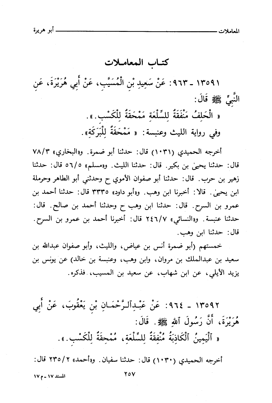 ١٣٥٩١ - عَنْ سَعِيدِ بْنِ الْمُسَيَّبِ، إِنَّ أَبَا هُرَيْرَةَ، رَضِيَ اللهُ عَنْهُ، قَالَ: سَمِعْتُ رَسُولَ اللهِ صلى الله عليه وسلم يَقُولُ: