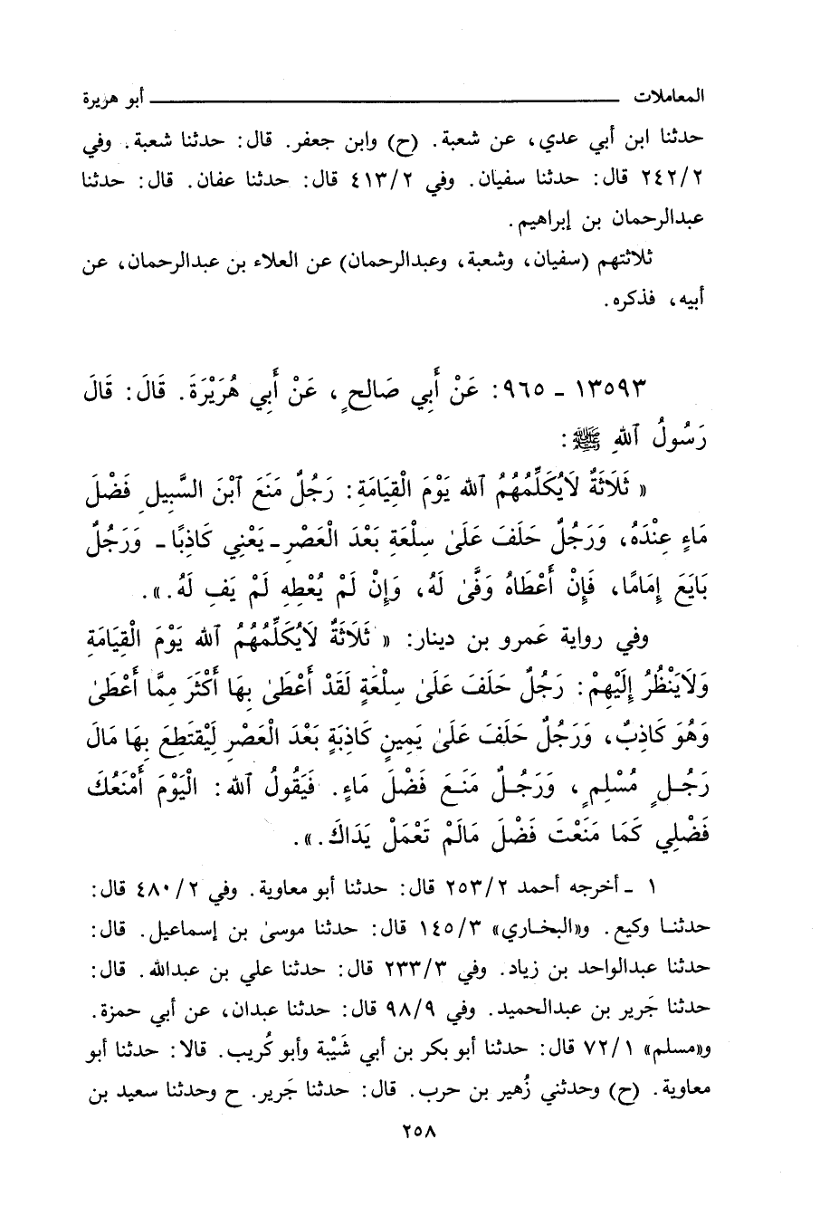 ـ وفي رواية: ثَلَاثَةٌ لَا يُكَلِّمُهُمُ اللهُ، وَلَا يَنْظُرُ إِلَيْهِمْ، وَلَا يُزَكِّيهِمْ، وَلَهُمْ عَذَابٌ أَلِيمٌ: رَجُلٌ عَلَى فَضْلِ مَاءٍ بِطَرِيقٍ يَمْنَعُ مِنْهُ ابْنَ السَّبِيلِ، وَرَجُلٌ بَايَعَ رَجُلاً لَا يُبَايِعُهُ إِلَاّ لِلدُّنْيَا، فَإِنْ أَعْطَاهُ مَا يُرِيدُ وَفَى لَهُ، وَإِلَاّ لَمْ يَفِ لَهُ، وَرَجُلٌ سَاوَمَ رَجُلاً بِسِلْعَةٍ بَعْدَ الْعَصْرِ، فَحَلَفَ بِاللهِ لَقَدْ أُعْطِيَ بِهِ كَذَا وَكَذَا، فَأَخَذَهَا.