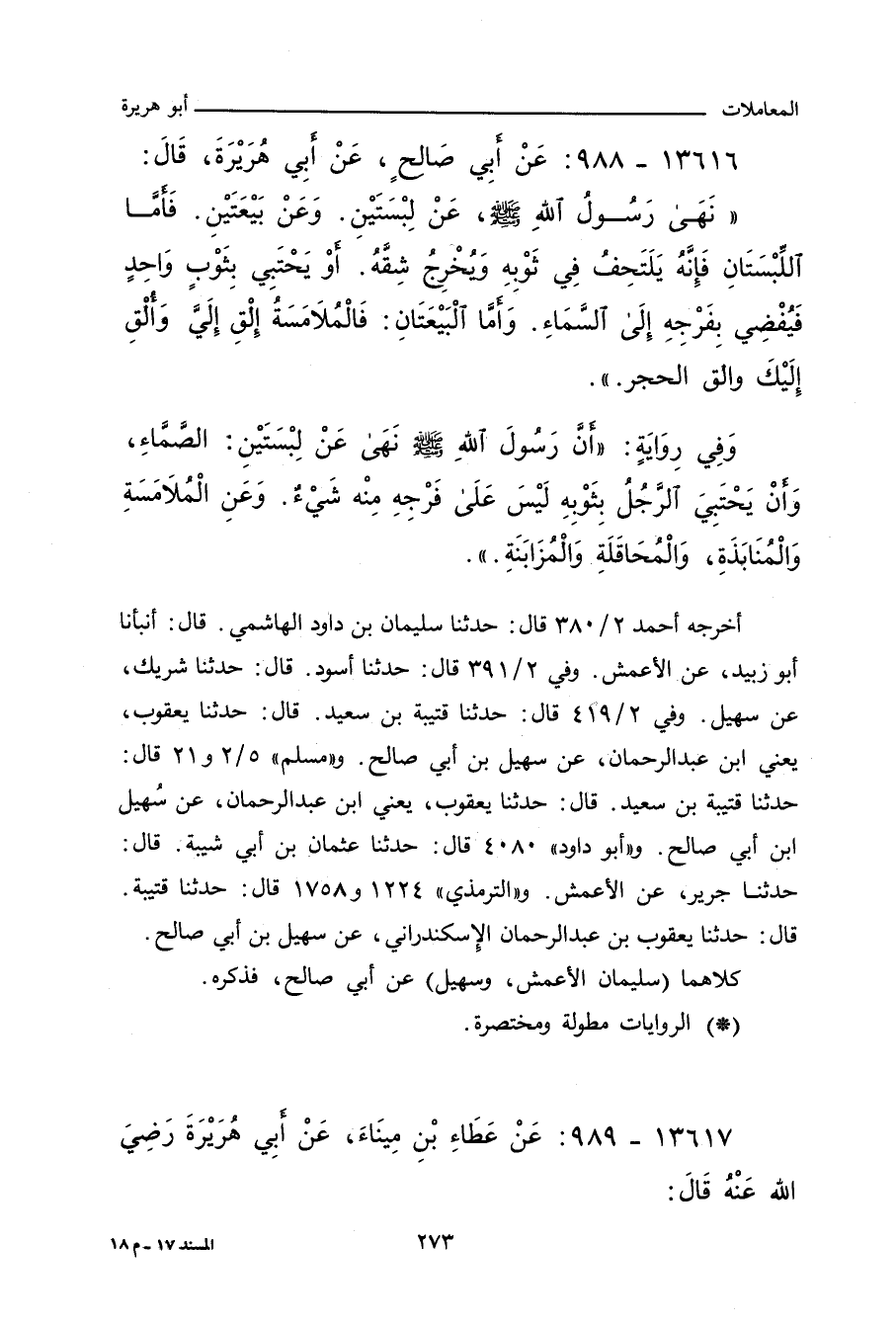 ـ وفي رواية: أَنَّ رَسُولَ اللهِ صلى الله عليه وسلم نَهَى عَنْ لُبْسَتَيْنِ: الصَّمَّاءِ، وَأَنْ يَحْتَبِيَ الرَّجُلُ بِثَوْبِهِ لَيْسَ عَلَى فَرْجِهِ مِنْهُ شَيْءٌ، وَعَنِ الْمُلَامَسَةِ وَالْمُنَابَذَةِ، وَالْمُحَاقَلَةِ وَالْمُزَابَنَةِ.