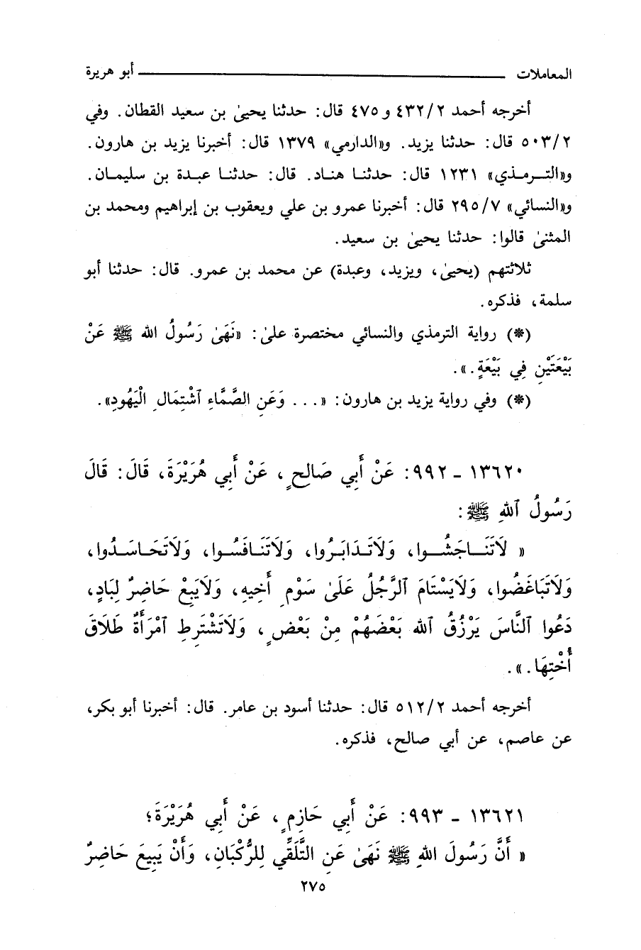 لَا تَنَاجَشُوا، وَلَا تَدَابَرُوا، وَلَا تَنَافَسُوا، وَلَا تَحَاسَدُوا، وَلَا تَبَاغَضُوا، وَلَا يَسْتَامُ الرَّجُلُ عَلَى سَوْمِ أَخِيهِ، وَلَا يَبِعْ حَاضِرٌ لِبَادٍ، دَعُوا النَّاسَ يَرْزُقُ اللهُ بَعْضَهُمْ مِنْ بَعْضٍ، وَلَا تَشْتَرِطِ امْرَأَةٌ طَلَاقَ أُخْتِهَا.