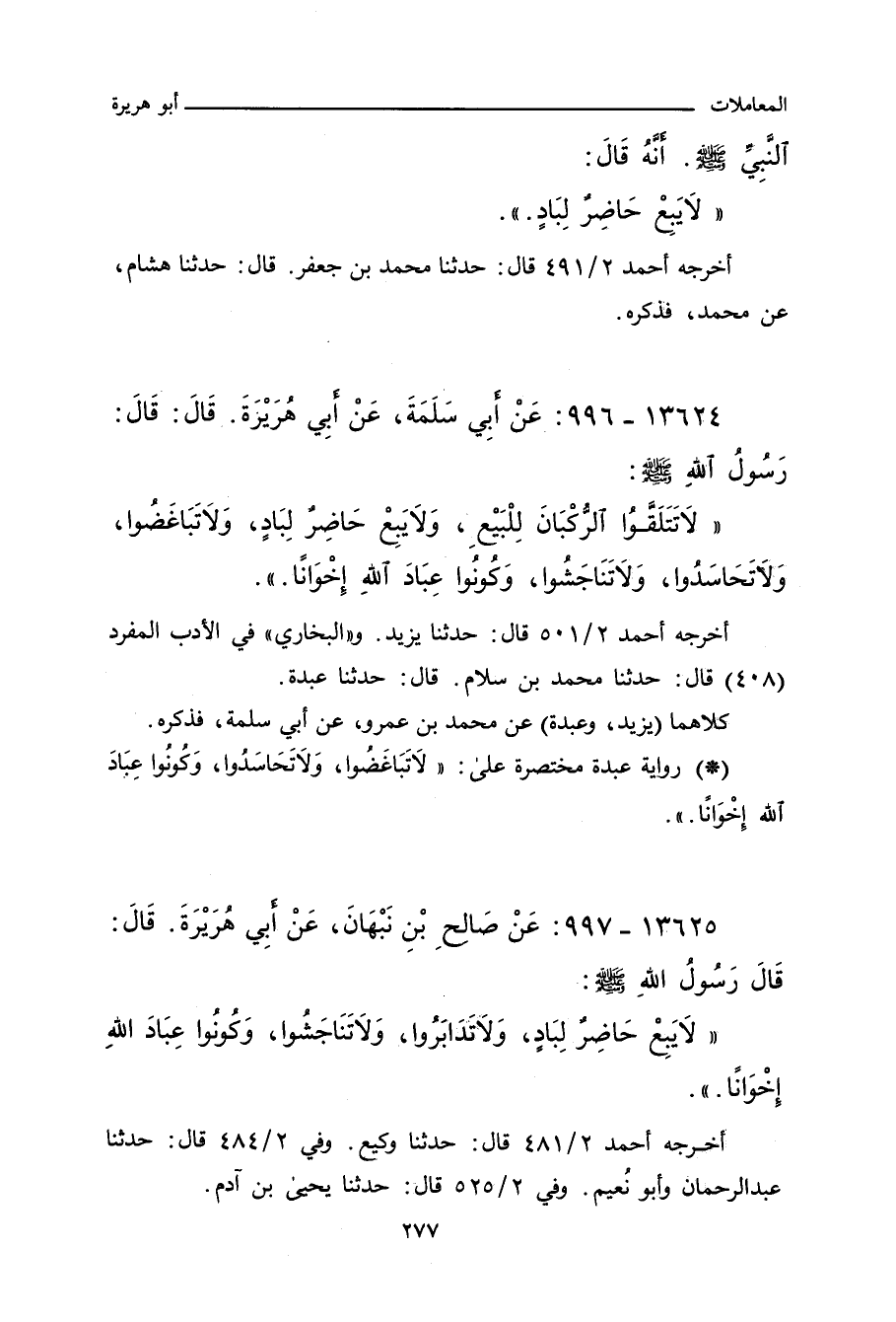 لَا تَلَقَّوُا الرُّكْبَانَ لِلْبَيْعِ، وَلَا يَبِعْ حَاضِرٌ لِبَادٍ، وَلَا تَبَاغَضُوا، وَلَا تَحَاسَدُوا، وَلَا تَنَاجَشُوا، وَكُونُوا عِبَادَ اللهِ إِخْوَانًا.