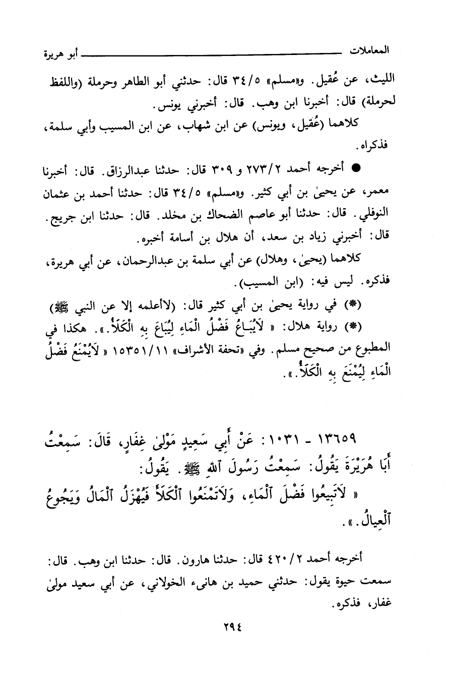 لَا تَمْنَعُوا فَضْلَ الْمَاءِ، وَلَا تَمْنَعُوا الْكَلأَ فَيَهْزُلَ الْمَالُ وَيَجُوعَ الْعِيَالُ.