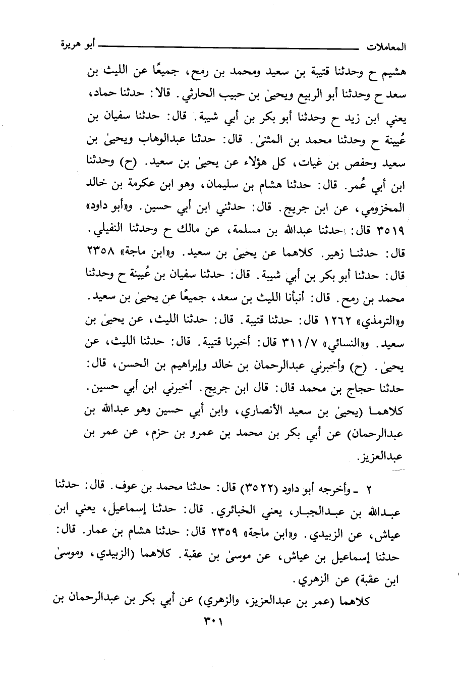 هشيم (ح) وحدثنا قتيبة بن سعيد، ومحمد بن رمح، جميعًا عن الليث بن سعد (ح) وحدثنا أبو الربيع، ويحيى بن حبيب الحارثي، قالا: حدثنا حماد، يعني ابن زيد (ح) وحدثنا أبو بكر بن أبي شيبة، حدَّثنا سفيان بن عيُينة (ح) وحدثنا محمد بن المثنى، حدَّثنا عبد الوهاب، ويحيى بن سعيد، وحفص بن غيات، كل هؤلاء عن يحيى بن سعيد. وفي (٣٩٩١) قال: حدَّثنا ابن أبي عُمر، حدَّثنا هشام بن سليمان، وهو ابن عكرمة بن خالد المخزومي، عن ابن جُريج، حدثني ابن أبي حسين. و"أبو داود" ٣٥١٩ قال: حدَّثنا عبد الله بن مسلمة، عن مالك (ح) وحدثنا النفيلي، حدَّثنا زهير، المعني، عن يحيى بن سعيد. و"ابن ماجة" ٢٣٥٨ قال: حدَّثنا أبو بكر بن أبي شيبة، حدَّثنا