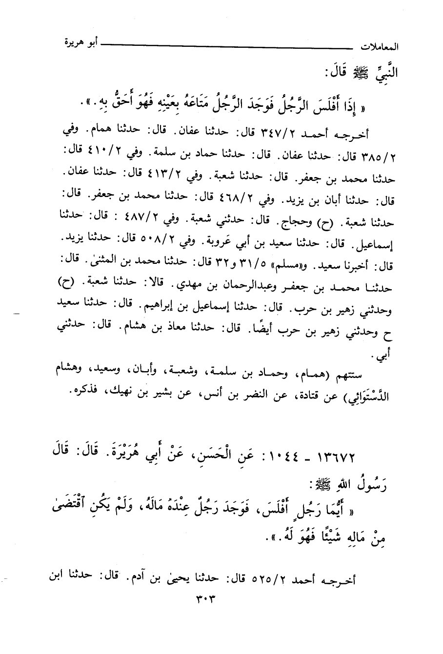 ـ وفي رواية: مَنْ وَجَدَ مَتَاعَهُ عِنْدَ مُفْلِسٍ بِعَيْنِهِ، فَهُوَ أَحَقُّ بِهِ.