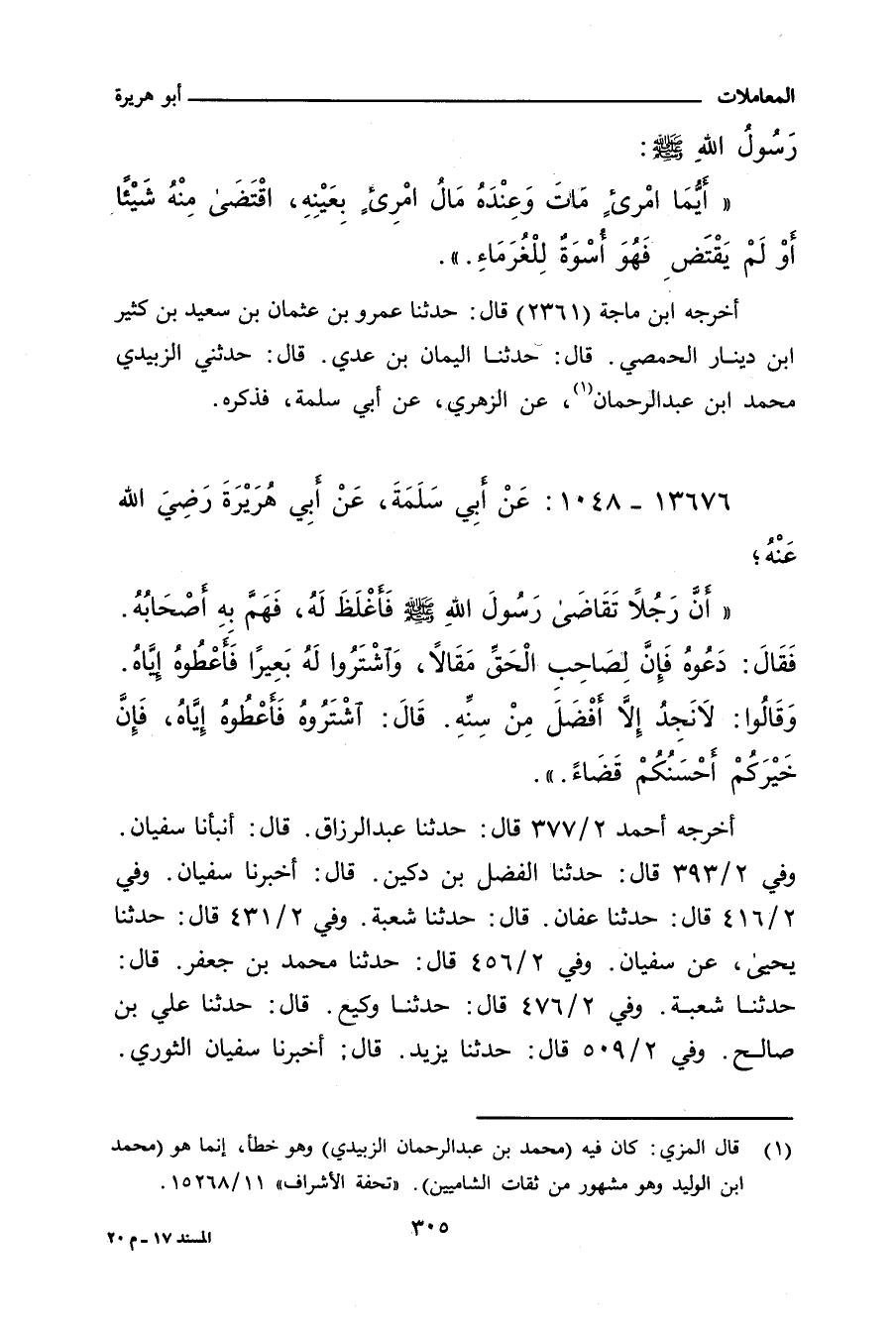 ـ وفي رواية: أَنَّ رَسُولَ اللهِ صلى الله عليه وسلم اسْتَقْرَضَ مِنْ رَجُلٍ بَعِيرًا، فَجَاءَ يَتَقَاضَاهُ بَعِيرَهُ، فَقَالَ: اطْلُبُوا لَهُ بَعِيرًا فَادْفَعُوهُ إِلَيْهِ، فَلَمْ يَجِدُوا إِلَاّ سِنًّا فَوْقَ سِنَّهِ، فَقَالُوا: يَا رَسُولَ اللهِ، لَمْ نَجِدْ إِلَاّ سِنًّا فَوْقَ سِنِّ بَعِيرِهِ، فَقَالَ: أَعْطُوهُ، فَإِنَّ خِيَارَكُمْ أَحَاسِنُكُمْ قَضَاءً.