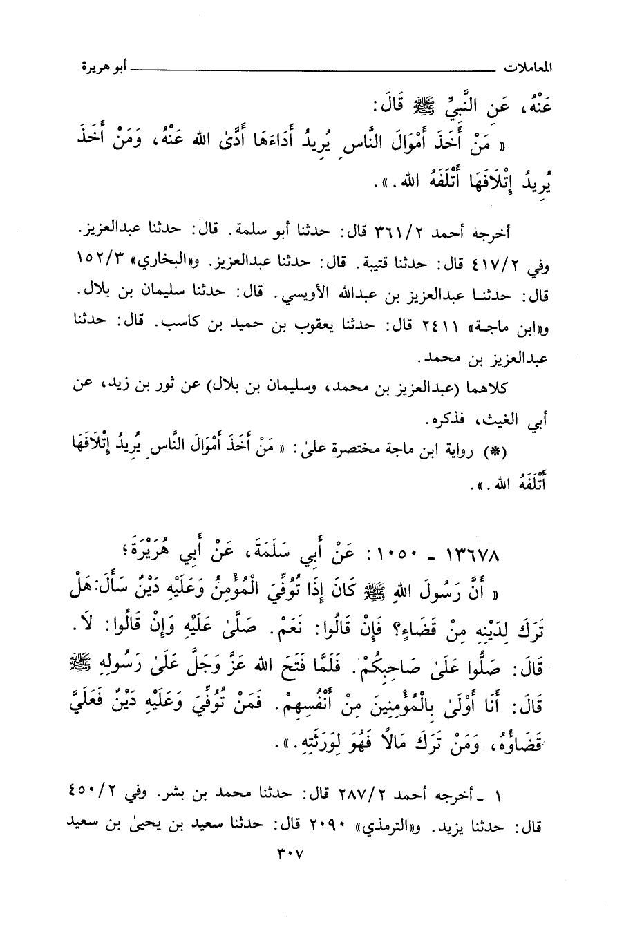 ـ لفظ ابن ماجة: مَنْ أَخَذَ أَمْوَالَ النَّاسِ يُرِيدُ إِتْلَافَهَا، أَتْلَفَهُ اللهُ.