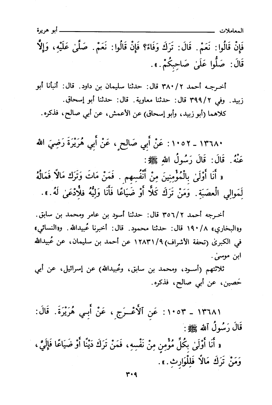 أَنَا أَوْلَى النَّاسِ بِأَنْفُسِهِمْ، مَنْ تَرَكَ مَالاً فَلِمَوَالِي عَصَبَتِهِ، وَمَنْ تَرَكَ ضِيَاعًا أَوْ كَلاًّ، فَأَنَا وَلِيُّهُ فَلأُدْعَى لَهُ.