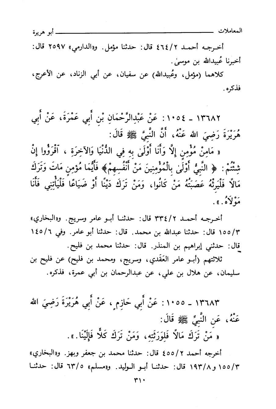 مَا مِنْ مُؤْمِنٍ إِلَاّ وَأَنَا أَوْلَى بِهِ فِي الدُّنْيَا وَالآخِرَةِ، اقْرَؤُوا إِنْ شِئْتُمْ: (النَّبِيُّ أَوْلَى بِالْمُؤْمِنِينَ مِنْ أَنْفُسِهِمْ) فَأَيُّمَا مُؤْمِنٍ هَلَكَ وَتَرَكَ مَالاً فَلْيَرِثْهُ عَصَبَتُهُ مَنْ كَانُوا، وَمَنْ تَرَكَ دَيْنًا أَوْ ضَيَاعًا فَلْيَأْتِنِي فَإِنِّي مَوْلَاهُ.