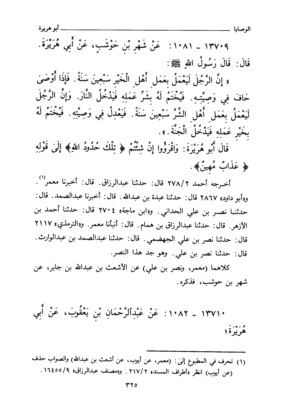 إِنَّ الرَّجُلَ لَيَعْمَلُ بِعَمَلِ أَهْلِ الْخَيْرِ سَبْعِينَ سَنَةً، فَإِذَا أَوْصَى حَافَ فِي وَصِيَّتِهِ فَيُخْتَمُ لَهُ بِشَرِّ عَمَلِهِ فَيَدْخُلُ النَّارَ، وَإِنَّ الرَّجُلَ لَيَعْمَلُ بِعَمَلِ أَهْلِ الشَّرِّ سَبْعِينَ سَنَةً، فَيَعْدِلُ فِي وَصِيَّتِهِ فَيُخْتَمُ لَهُ بِخَيْرِ عَمَلِهِ فَيَدْخُلُ الْجَنَّةَ.