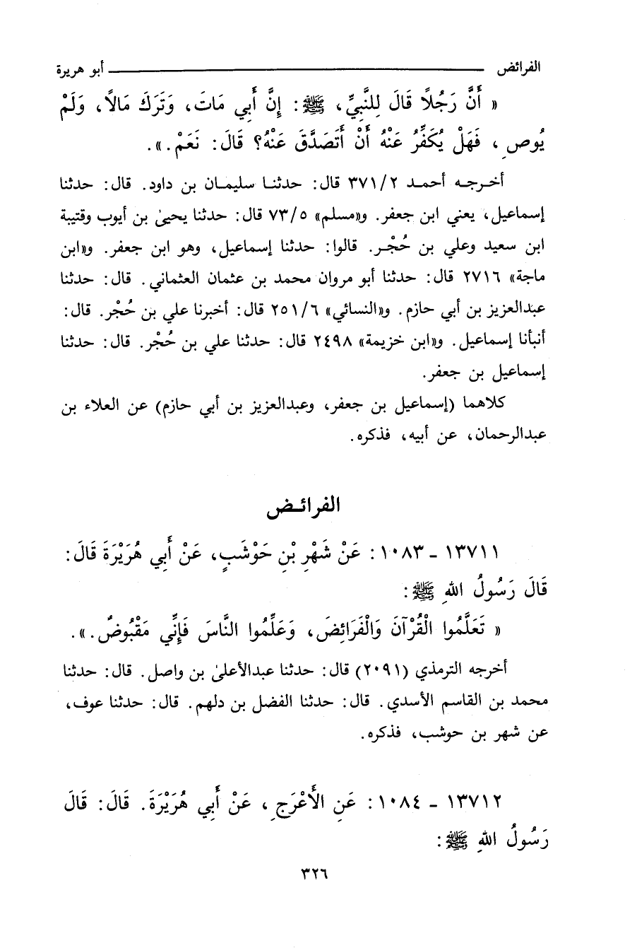 تَعَلَّمُوا الْقُرْآنَ وَالْفَرَائِضَ، وَعَلِّمُوا النَّاسَ فَإِنِّي مَقْبُوضٌ.