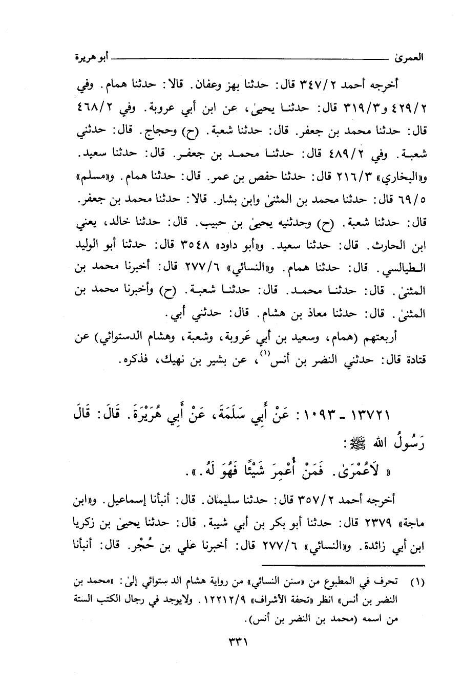 أربعتهم (سعيد بن أبي عَروبة، وهمام بن يحيى، وشعبة، وهشام الدستوائي) عن قتادة، عن النضر بن أنس، عن بشير بن نهيك، فذكره.