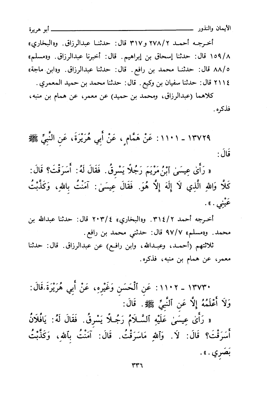 رَأَى عِيسَى ابْنُ مَرْيَمَ رَجُلاً يَسْرِقُ، فَقَالَ لَهُ: أَسَرَقْتَ؟ قَالَ: كَلَاّ وَاللهِ الَّذِي لَا إِلَهَ إِلَاّ هُوَ، فَقَالَ عِيسَى: آمَنْتُ بِاللهِ، وَكَذَّبْتُ عَيْنِى.