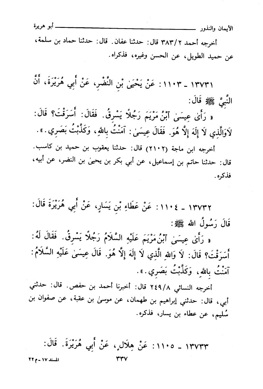 رَأَى عِيسَى ابْنُ مَرْيَمَ عَلَيْهِ السَّلَامُ رَجُلاً يَسْرِقُ، فَقَالَ لَهُ: أَسَرَقْتَ؟ قَالَ: لَا وَاللهِ الَّذِي لَا إِلَهَ إِلَاّ هُوَ، قَالَ عِيسَى، عَلَيْهِ السَّلَامُ: آمَنْتُ بِاللهِ، وَكَذَّبْتُ بَصَرِي.
