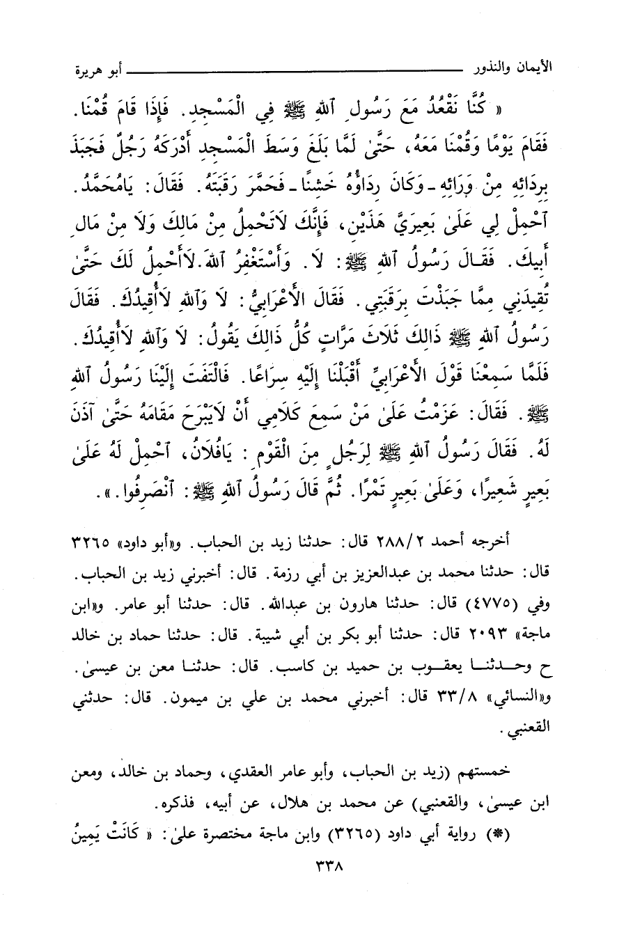 ـ وفي رواية: كَانَ النَّبِيُّ صلى الله عليه وسلم يَجْلِسُ مَعَنَا فِي الْمَجْلِسِ يُحَدِّثُنَا، فَإِذَا قَامَ قُمْنَا قِيَامًا حَتَّى نَرَاهُ قَدْ دَخَلَ بَعْضَ بُيُوتِ أَزْوَاجِهِ، فَحَدَّثَنَا يَوْمًا، فَقُمْنَا حِينَ قَامَ، فَنَظَرْنَا إِلَى أَعْرَابِيٍّ قَدْ أَدْرَكَهُ فَجَبَذَهُ بِرِدَائِهِ فَحَمَّرَ رَقَبَتَهُ، قَالَ أَبُو هُرَيْرَةَ: وَكَانَ رِدَاءً خَشِنًا، فَالْتَفَتَ، فَقَالَ لَهُ الأَعْرَابِيُّ: احْمِلْ لِي عَلَى بَعِيرَيَّ هَذَيْنِ، فَإِنَّكَ لَا تَحْمِلُ لِي مِنْ مَالِكَ وَلَا مِنْ مَالِ أَبِيكَ، فَقَالَ النَّبِيُّ صلى الله عليه وسلم: لَا، وَأَسْتَغْفِرُ اللهَ، لَا، وَأَسْتَغْفِرُ اللهَ، لَا، وَأَسْتَغْفِرُ اللهَ، لَا أَحْمِلُ لَكَ حَتَّى تَقِيدَنِي مِنْ جَبْذَتِكَ الَّتِي جَبَذْتَنِي، فَكُلُّ ذَلِكَ يَقُولُ لَهُ الأَعْرَابِيُّ: وَاللهِ لَا أَقِيدُكَهَا، فَذَكَرَ الْحَدِيثَ، قَالَ: ثُمَّ دَعَا رَجُلاً فَقَالَ لَهُ: احْمِلْ لَهُ عَلَى بَعِيرَيْهِ هَذَيْنِ، عَلَى بَعِيرٍ شَعِيرًا، وَعَلَى الآخَرِ تَمْرًا، ثُمَّ الْتَفَتَ إِلَيْنَا، فَقَالَ: انْصَرِفُوا عَلَى بَرَكَةِ اللهِ تَعَالَى.