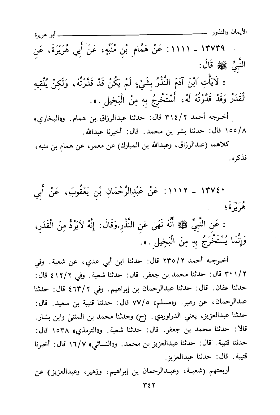 ـ لفظ عبد الرزاق: لَا يَأْتِي ابْنَ آدَمَ النَّذْرُ بِشَيْءٍ لَمْ أَكُنْ قَدَّرْتُهُ لَهُ، وَلَكِنَّهُ يَلْقِيهِ النَّذْرُ بِمَا قَدْ قَدَّرْتُهُ لَهُ، يُسْتَخْرَجُ بِهِ مِنَ الْبَخِيلِ، يُؤْتِينِي عَلَيْهِ مَا لَمْ يَكُنْ آتَانِى عَلَيْهِ مِنْ قَبْلُ.