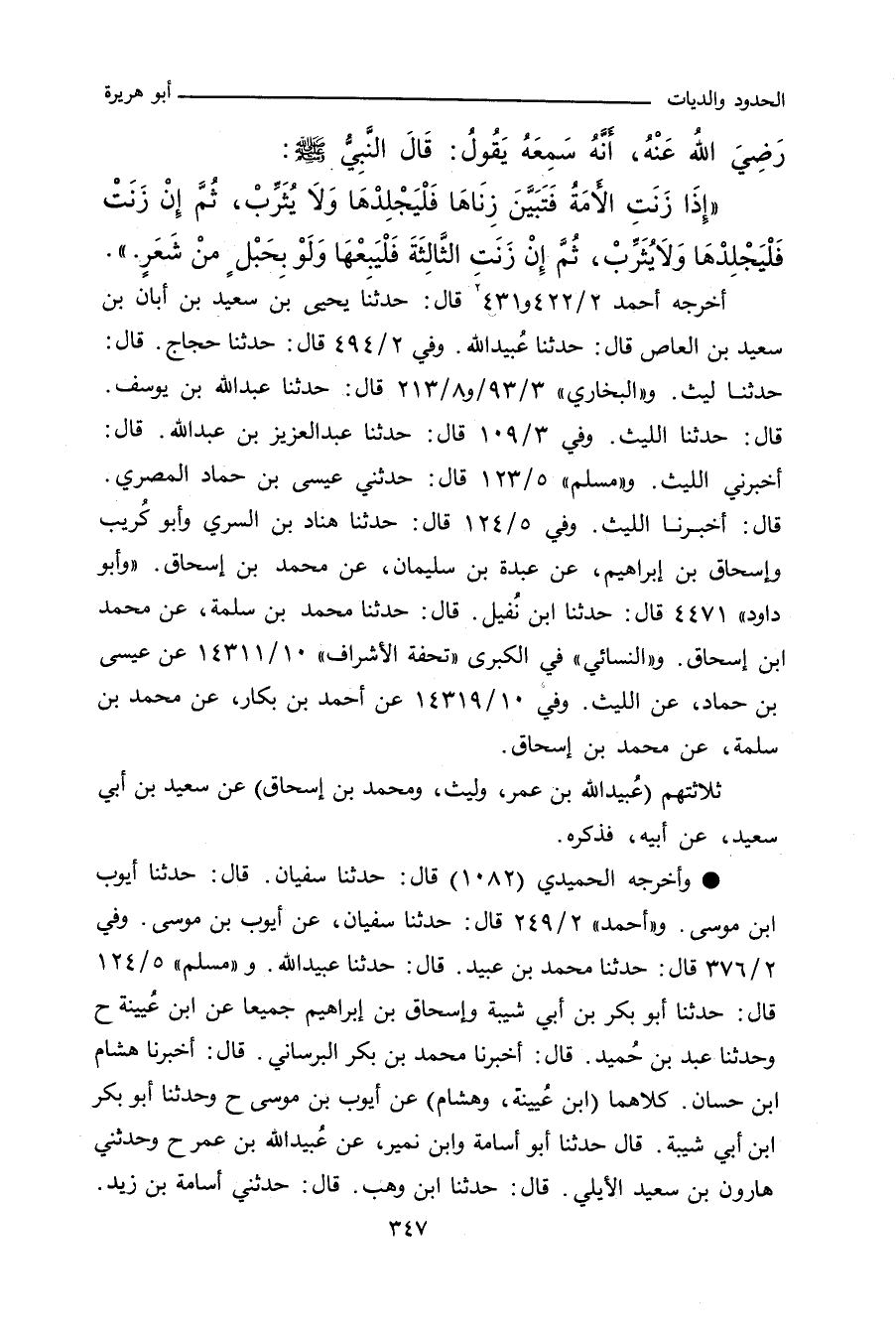 ـ وفي رواية: عَنِ النَّبِيِّ صلى الله عليه وسلم، بِهَذَا الْحَدِيثِ، قَالَ فِي كُلِّ مَرَّةٍ: فَلْيَضْرِبْهَا كِتَابُ اللهِ وَلَا يُثَرِّبْ عَلَيْهَا، وَقَالَ فِي الرَّابِعَةِ: فَإِنْ عَادَتْ فَلْيَضْرِبْهَا كِتَابُ اللهِ ثُمَّ لْيَبِعْهَا وَلَوْ بِحَبْلٍ مِنْ شَعْرٍ.