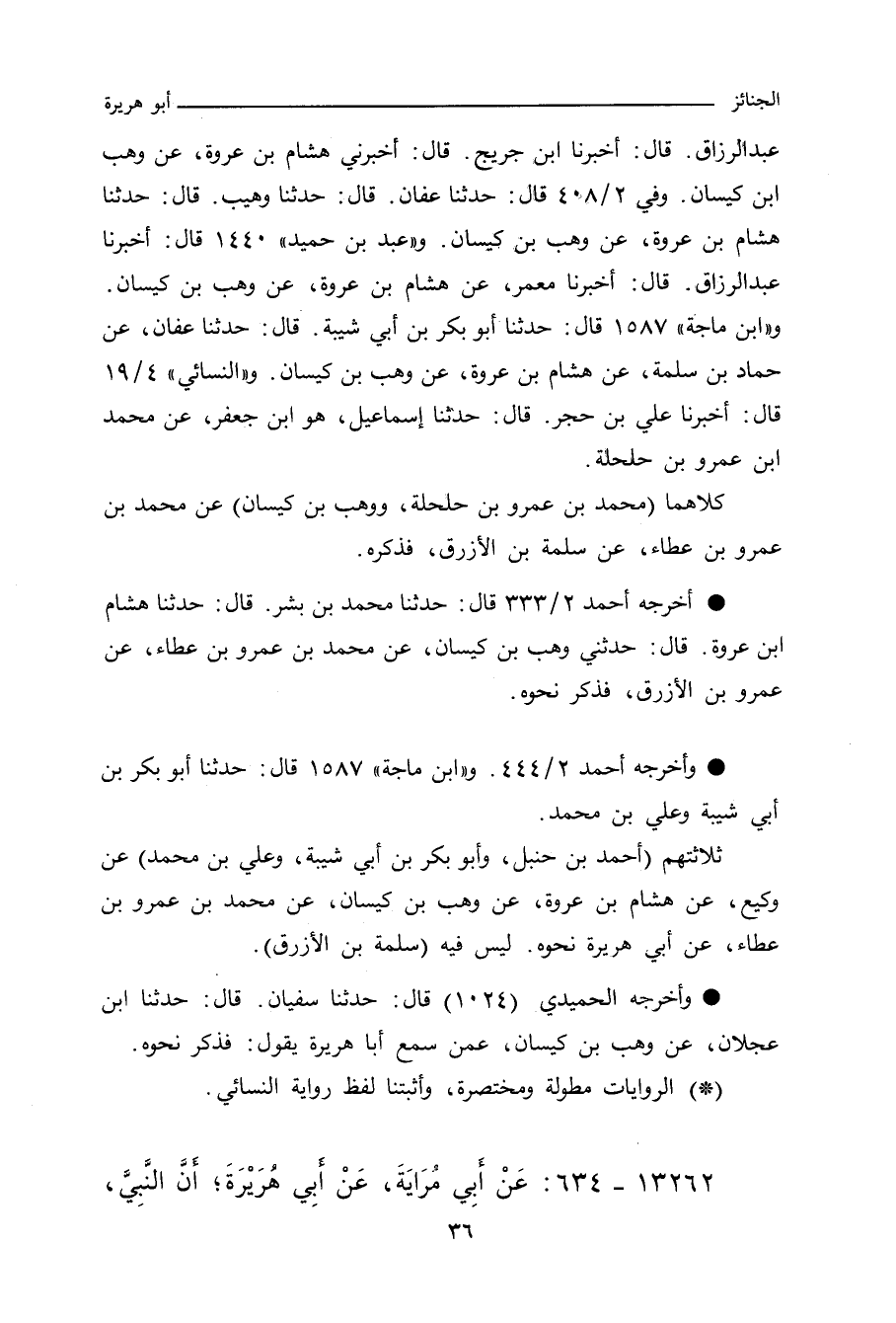 عبد الرزاق، أخبرنا ابن جريج، أخبرني هشام بن عروة، عن وهب بن كيسان. وفي ٢/ ٤٠٨ (٩٢٨٢) قال: حدثنا عفان، قال: حدثنا وهيب، قال: حدثنا هشام بن عروة، عن وهب بن كيسان. و"عبد بن حميد" ١٤٤٠ قال: أخبرنا عبد الرزاق، أخبرنا معمر، عن هشام بن عروة، عن وهب بن كيسان. و"ابن ماجة" ١٥٨٧ قال: حدثنا أبو بكر بن أبي شيبة، حدثنا عفان، عن حماد بن سلمة، عن هشام بن عروة، عن وهب بن كيسان. و"النَّسائي" ٤/ ١٩، وفي "الكبرى" ١٩٩٨ قال: أخبرنا علي بن حجر، قال: حدثنا إسماعيل، هو ابن جعفر، عن محمد بن عمرو بن حلحلة. و"ابن حِبَّان" ٣١٥٧ قال: أخبرنا عبد الله بن محمد الأزدي، قال: حدَّثنا إسحاق بن إبراهيم، قال: أخبرنا عبد الرزاق، قال: أخبرنا معمر، عن هشام بن عروة، قال: أخبرني وهب بن كيسان.