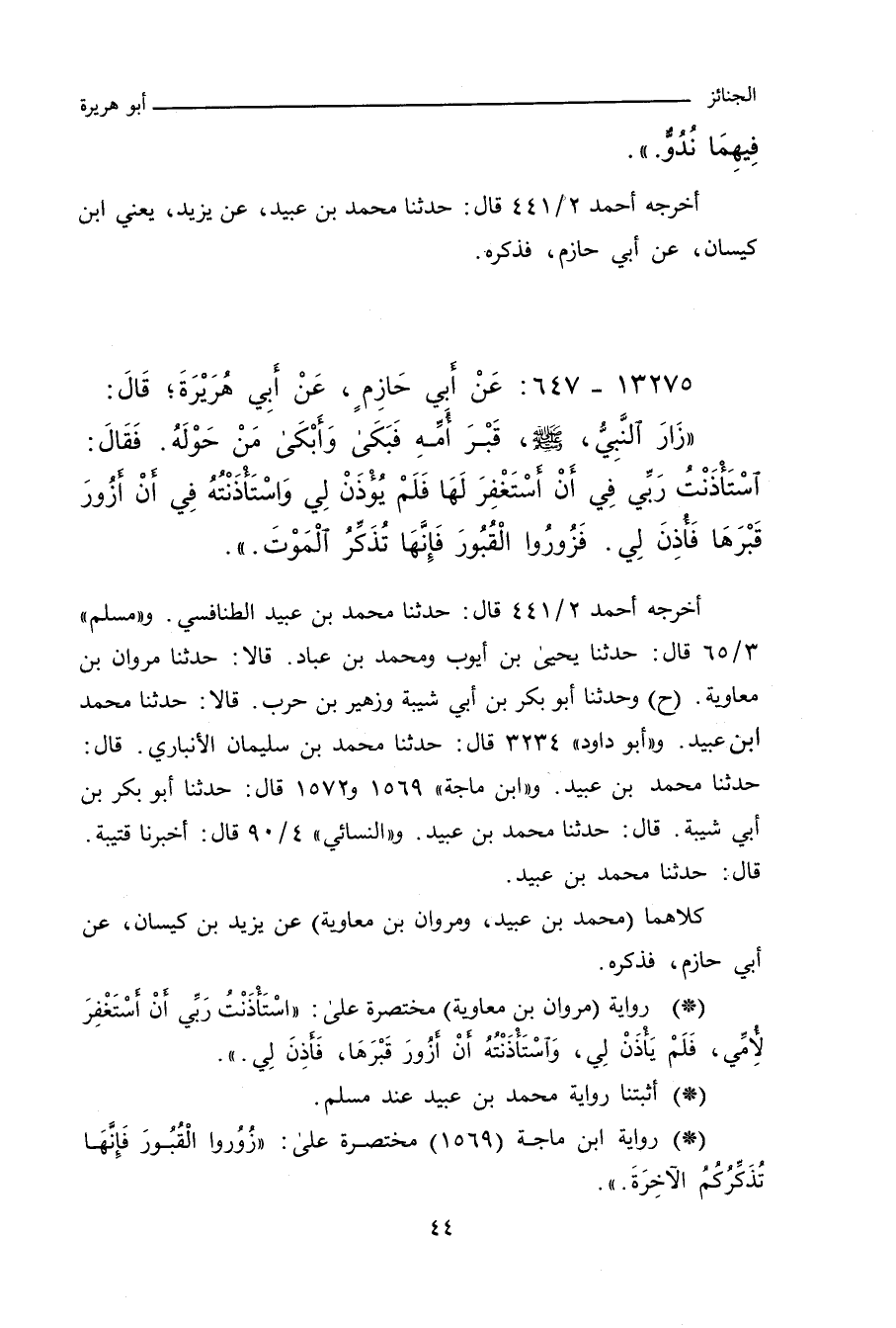 - وفي رواية: اسْتَأْذَنْتُ رَبِّي أَنْ أَسْتَغْفِرَ لأُمِّي، فَلَمْ يَأْذَنْ لِي، وَاسْتَأْذَنْتُهُ أَنْ أَزُورَ قَبْرَهَا فَأَذِنَ لِي.