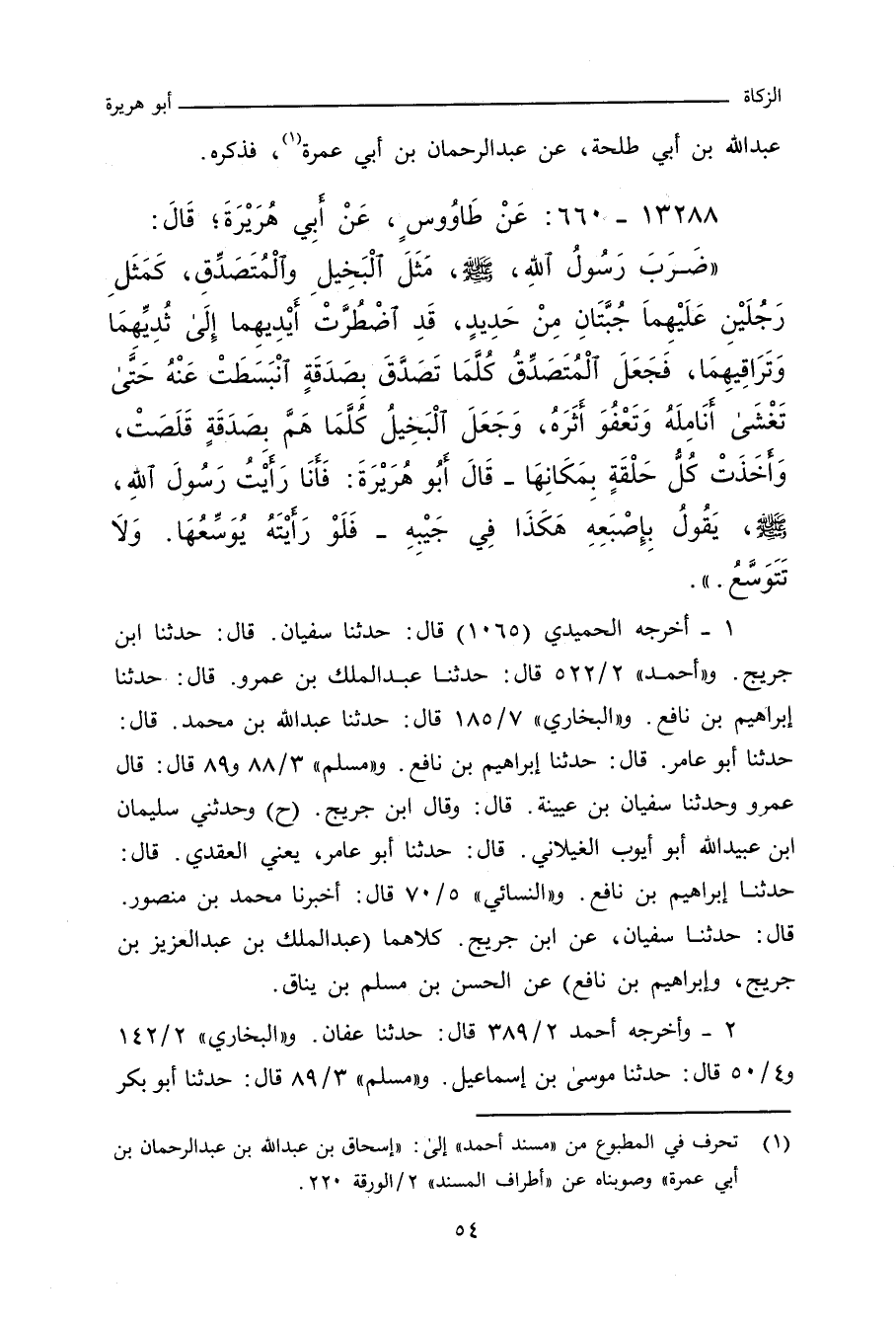 ضَرَبَ رَسُولُ اللهِ صلى الله عليه وسلم مَثَلَ الْبَخِيلِ وَالْمُتَصَدِّقِ، كَمَثَلِ رَجُلَيْنِ عَلَيْهِمَا جُبَّتَانِ مِنْ حَدِيدٍ، قَدِ اضْطُرَّتْ أَيْدِيهِمَا إِلَى ثَدْيَيْهِمَا وَتَرَاقِيهِمَا، فَجَعَلَ الْمُتَصَدِّقُ كُلَّمَا تَصَدَّقَ بِصَدَقَةٍ انْبَسَطَتْ عَنَهُ، حَتَّى تَغْشَى أَنَامِلَهُ وَتَعْفُوَ أَثَرَهُ، وَجَعَلَ الْبَخِيلُ كُلَّمَا هَمَّ بِصَدَقَةٍ قَلَصَتْ كُلُّ حَلْقَةٍ وَأَخَذَتْ بِمَكَانِهَا، قَالَ أَبُو هُرَيْرَةَ: فَأَنَا رَأَيْتُ رَسُولَ اللهِ صلى الله عليه وسلم يَقُولُ بِإِصْبُعِهِ فِي جُبَّتِهِ، فَلَوْ رَأَيْتَهُ يُوَسِّعُهَا وَلَا تُوَسَّعُ.