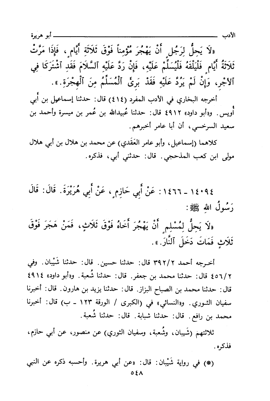 لا يَحِلُّ لِرَجُلٍ أَنْ يَهْجُرَ مُؤْمِنًا فَوْقَ ثَلاثَةِ أَيَّامٍ، فَإِذَا مَرَّتْ ثَلاثَةُ أَيَّامٍ فَلْيَلْقَهُ فَلْيُسَلِّمْ عَلَيْهِ، فَإِنْ رَدَّ عَلَيْهِ السَّلامَ فَقَدِ اشْتَرَكَا فِي الأَجْرِ، وَإِنْ لَمْ يَرُدَّ عَلَيْهِ فَقَدْ بَرِيءَ الْمُسْلِمُ مِنَ الْهِجْرَةِ.