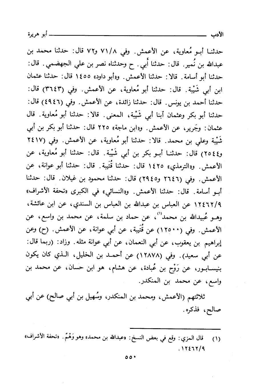 حدثنا أبو مُعاوية، عن الأعمش. وفي (٦٩٥٣) قال: حدَّثنا محمد بن عبد الله بن نمير، حدَّثنا أبي (ح) وحدثناه نصر بن علي الجهضمي، حدَّثنا أبو أسامة، قالا: حدثنا الأعمش. و"أبو داود" ١٤٥٥ قال: حدَّثنا عثمان بن أبي شَيْبة، حدَّثنا أبو مُعاوية، عن الأعمش. وفي (٣٦٤٣) قال: حدَّثنا أحمد بن يونس، حدَّثنا زائدة، عن الأعمش. وفي (٤٩٤٦) قال: حدَّثنا أبو بكر، وعثمان، ابنا أبي شَيْبة، المعنى، قالا: حدثنا أبو مُعاوية، قال عثمان: وجَرير الرازي، عن الأعمش. و"ابن ماجة" ٢٢٥ قال: حدَّثنا أبو بكر بن أبي شَيْبة، وعلي بن محمد، قالا: حدثنا أبو مُعاوية، عن الأعمش. وفي (٢٤١٧ و ٢٥٤٤) قال: حدَّثنا أبو بكر بن أبي شَيْبة، حدَّثنا أبو مُعاوية، عن الأعمش. و"التِّرمِذي" ١٤٢٥ قال: حدَّثنا قُتَيبة، حدَّثنا أبو عوانة، عن الأعمش. وفي (٢٦٤٦ و ٢٩٤٥) قال: حدَّثنا محمود بن غيلان، حدَّثنا أبو أسامة، حدَّثنا الأعمش. و"النَّسائي" في "الكبرى" ٧٢٤٥ قال: حدَّثنا أحمد بن الخليل النيسابوري، وأصله بغدادي، قال: حدَّثنا روح، وهو