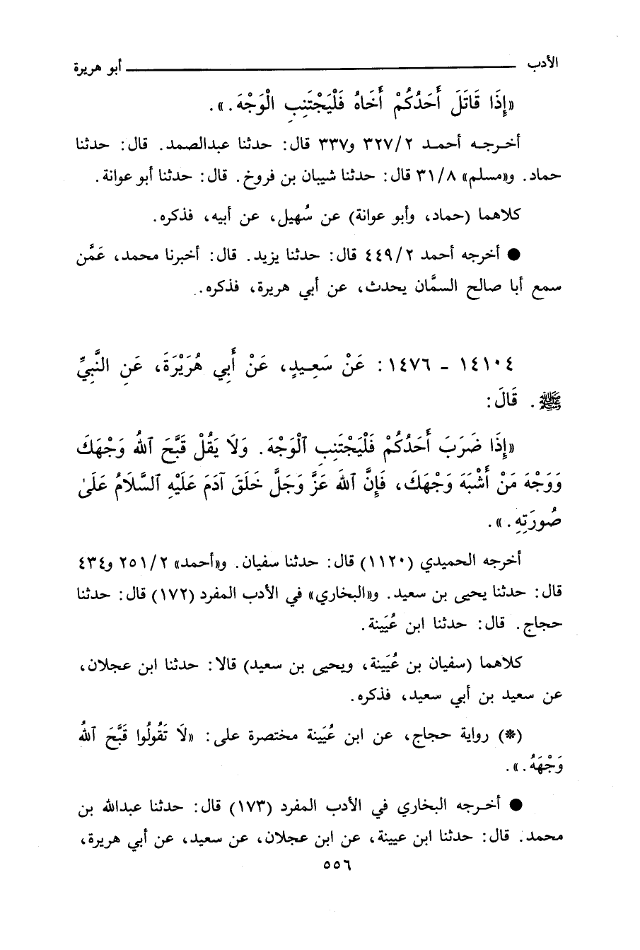 - وفي رواية: لا يَقُولَنَّ أَحَدُكُمْ قَبَّحَ اللهُ وَجْهَكَ وَوَجْهَ مَنْ أَشْبَهَ وَجْهَكَ، فَإِنَّ اللهَ خَلَقَ آدَمَ عَلَى صُورَتِهِ.