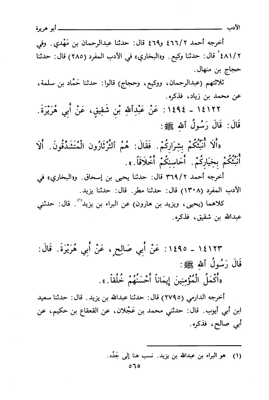 أخرجه أحمد ٢/ ٤٦٦ (١٠٠٢٣) و ٢/ ٤٦٩ (١٠٠٦٨) قال: حدَّثنا عبد الرحمن بن مَهْدي. وفي ٢/ ٤٨١ (١٠٢٣٧ و ١٠٢٤٥) قال: حدَّثنا وكيع. و"البُخاري" في "الأدب المفرد" ٢٨٥ قال: حدَّثنا حجاج بن منهال. و"ابن حِبَّان" ٩١ قال: أخبرنا عمران بن موسى بن مجاشع، حدثنا هدبة بن خالد القيسي.