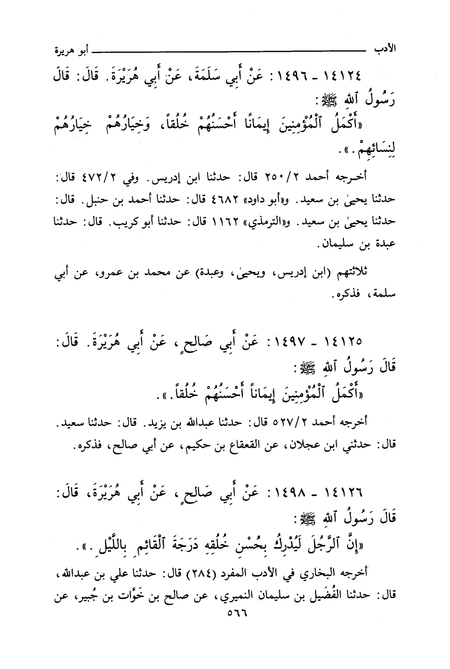 - وفي رواية: أَكْمَلُ الْمُؤْمِنِينَ إِيمَانًا، وَأَفْضَلُ الْمُؤْمِنِينَ إِيمَانًا، أَحْسَنُهُمْ خُلُقًا.