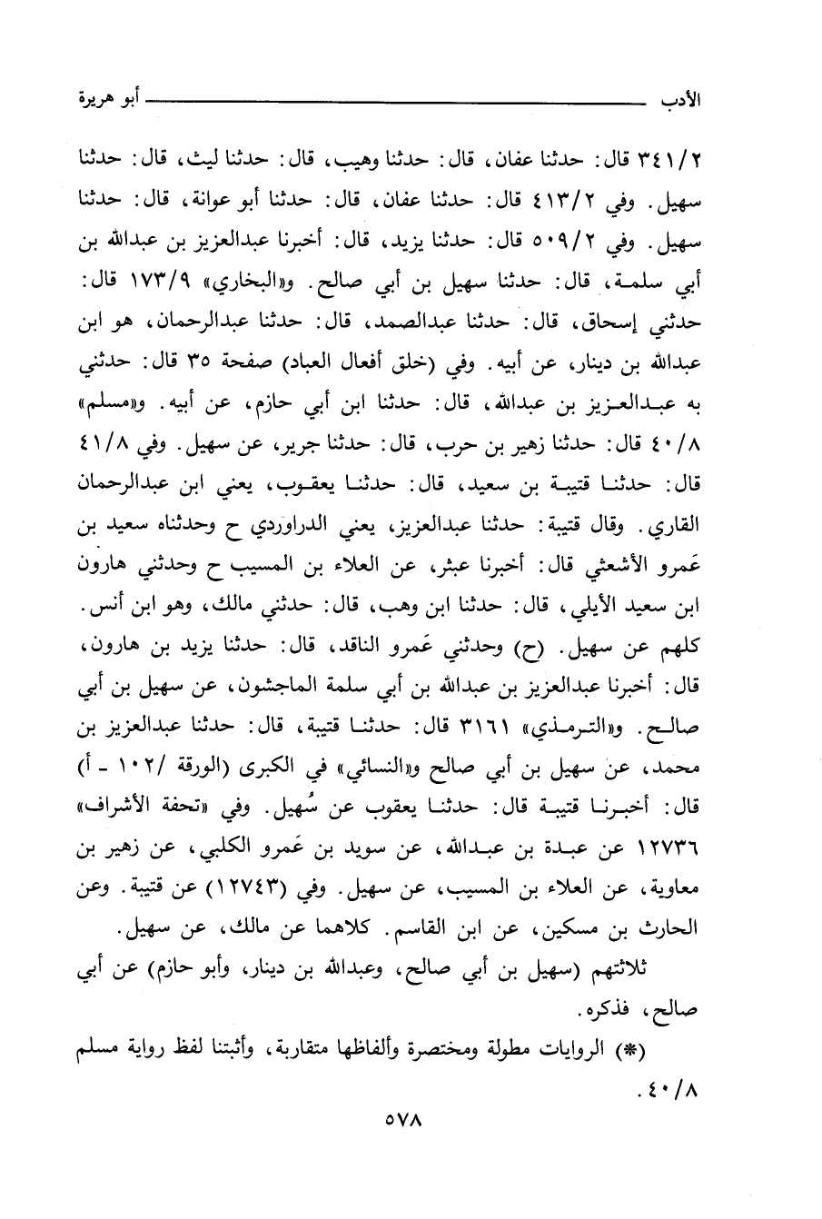 ٢/ ٣٤١ (٨٤٨١) قال: حدَّثنا عفان، حدَّثنا وهيب، حدَّثنا سهيل. وفي ٢/ ٤١٣ (٩٣٤١) قال: حدَّثنا عفان، قال: حدَّثنا أبو عوانة، قال: حدَّثنا سهيل. وفي ٢/ ٥٠٩ (١٠٦٢٣) قال: حدَّثنا يزيد، أخبرنا عبد العزيز بن عبد الله بن أبي سلمة، حدَّثنا سهيل بن أبي صالح. و"البُخاري" ٧٤٨٥ قال: حدثني إسحاق، حدَّثنا عبد الصمد، حدَّثنا عبد الرحمن، هو ابن عبد الله بن دينار، عن أبيه. وفي "خلق أفعال العباد" ٣٥ قال: حدَّثنا به عبد العزيز بن عبد الله، حدَّثنا ابن أبي حازم، عن أبيه. و"مسلم" ٦٧٩٨ قال: حدَّثنا زهير بن حرب، حدَّثنا جرير، عن سهيل. وفي (٦٧٩٩) قال: حدَّثنا قتيبة بن سعيد، حدَّثنا يعقوب، يعني ابن عبد الرحمن القاري، وقال قتيبة: حدثنا عبد العزيز، يعني الدراوردي (ح) وحدثناه سعيد بن عَمْرو الأشعثي، أخبرنا عبثر، عن العلاء بن المسيب (ح) وحدثني هارون بن سعيد الأيلي، حدَّثنا ابن وهب، حدثني مالك، وهو ابن أنس، كلهم عن سهيل. وفي (٦٨٠٠) قال: حدثني عَمْرو الناقد، حدَّثنا يزيد بن هارون، أخبرنا عبد العزيز بن عبد الله بن أبي سلمة الماجشون، عن سهيل بن أبي صالح. و"التِّرمِذي" ٣١٦١ قال: حدَّثنا قتيبة، حدَّثنا عبد العزيز بن محمد، عن سهيل بن أبي صالح. و"النَّسائي" في "الكبرى" ٧٧٠٠ و ١١٩٣٧ قال: أخبرنا قتيبة بن سعيد، قال: حدَّثنا يعقوب، عن سُهيل. وفي (١١٩٣٨) وعن عبدة بن عبد الله، عن سويد بن عَمْرو الكلبي، عن زهير بن معاوية، عن العلاء بن المسيب، عن سهيل بن أبي صالح. وفي (١١٩٣٩) وعن قتيبة بن سعيد، عن مالك، عن سهيل بن أبي صالح. وفي (١١٩٤٠) وعن الحارث بن مسكين، عن ابن القاسم، عن