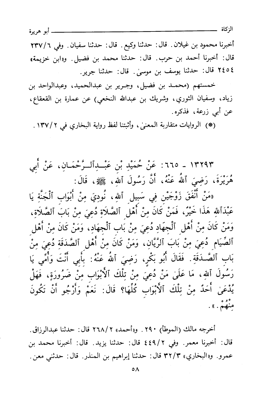 مَنْ أَنْفَقَ زَوْجَيْنِ فِي سَبِيلِ اللهِ، نُودِيَ فِي الْجَنَّةِ، يَا عَبْدَ اللهِ هَذَا خَيْرٌ، فَمَنْ كَانَ مِنْ أَهْلِ الصَّلَاةِ دُعِيَ مِنْ بَابِ الصَّلَاةِ، وَمَنْ كَانَ مِنْ أَهْلِ الْجِهَادِ دُعِيَ مِنْ بَابِ الْجِهَادِ، وَمَنْ كَانَ مِنْ أَهْلِ الصَّدَقَةِ دُعِيَ مِنْ بَابِ الصَّدَقَةِ، وَمَنْ كَانَ مِنْ أَهْلِ الصِّيَامِ دُعِيَ مِنْ بَابِ الرَّيَّانِ، فَقَالَ أَبُو بَكْرٍ الصِّدِّيقُ: يَا رَسُولَ اللهِ، مَا عَلَى مَنْ يُدْعَى مِنْ هَذِهِ الأَبْوَابِ مِنْ ضَرُورَةٍ، فَهَلْ يُدْعَى أَحَدٌ مِنْ هَذِهِ الأَبْوَابِ كُلِّهَا؟ قَالَ: نَعَمْ، وَأَرْجُو أَنْ تَكُونَ مِنْهُمْ.