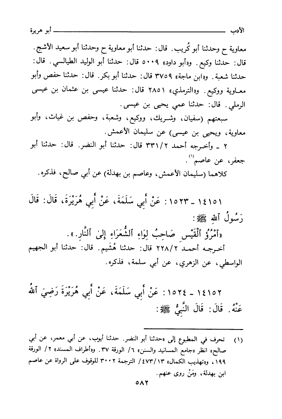 معاوية (ح) وحدثنا أبو كُريب، حدَّثنا أبو معاوية (ح) وحدثنا أبو سعيد الأشج، حدَّثنا وكيع. و"أبو داود" ٥٠٠٩ قال: حدَّثنا أبو الوليد الطيالسي، حدَّثنا شعبة. و"ابن ماجة" ٣٧٥٩ قال: حدَّثنا أبو بكر، حدَّثنا حفص، وأبو معاوية، ووكيع. و"التِّرمِذي" ٢٨٥١ قال: حدَّثنا عيسى بن عثمان بن عيسى الرملي، حدَّثنا عمي يحيى بن عيسى. و"ابن حِبَّان" ٥٧٧٧ قال: أخبرنا الفَضْل بن الحُبَاب الجُمَحِي، حدَّثنا مُسَدَّد بن مُسَرْهَد، حدَّثنا أبو مُعاوية. وفي (٥٧٧٩) قال: أخبرنا أبو عَرُوبة، قال: حدَّثنا بِشْر بن خالد، قال: حدَّثنا مُحَمد بن جَعْفر، عن شُعْبَة.