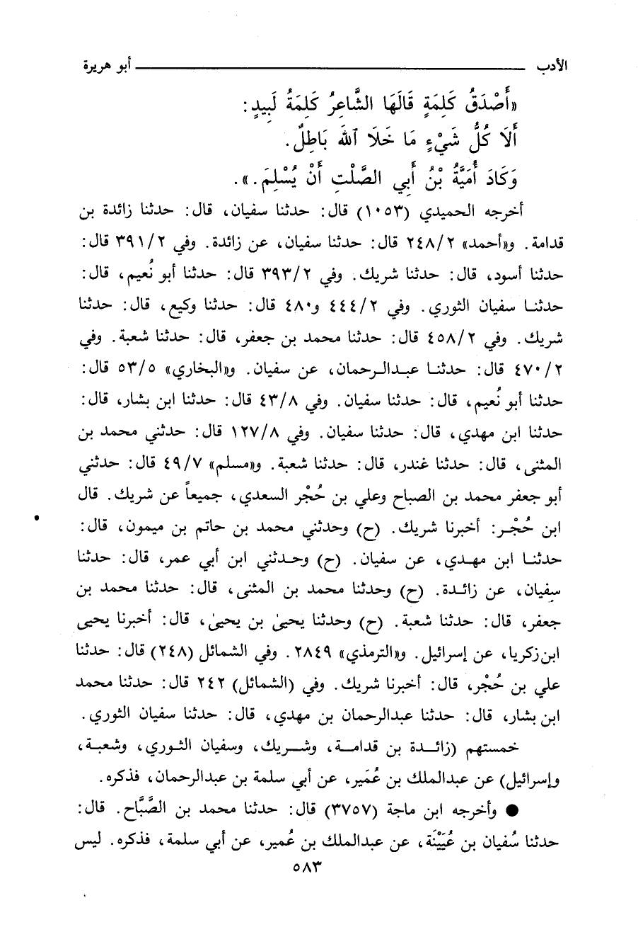 - وفي رواية: سَمِعْتُ رَسُولَ اللهِ صلى الله عليه وسلم يَقُولُ عَلَى الْمِنْبَرِ: أَشْعَرُ كَلِمَةٍ قَالَتْهَا الْعَرَبُ، قَوْلُ لَبِيدِ بْنِ رَبِيعَةَ: