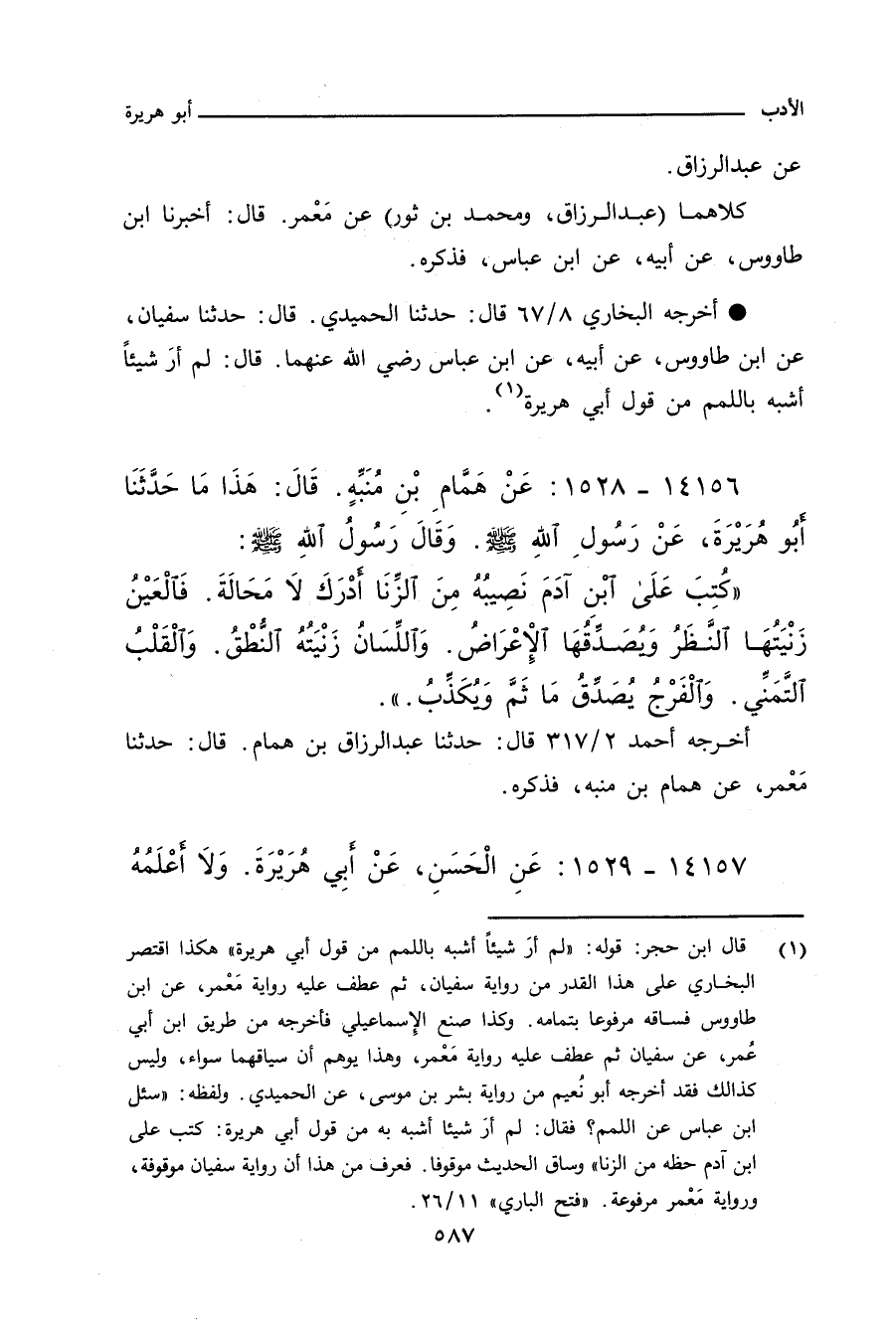 - أخرجه البخاري (٦٢٤٣) قال: حدَّثنا الحميدي، حدَّثنا سفيان، عن ابن طاووس، عن أبيه، عن ابن عباس، رضي الله عنهما، قَالَ: لَمْ أَرَ شَيْئًا أَشْبَهَ بِاللَّمَمِ مِنْ قَوْلِ أَبِي هُرَيْرَةَ.