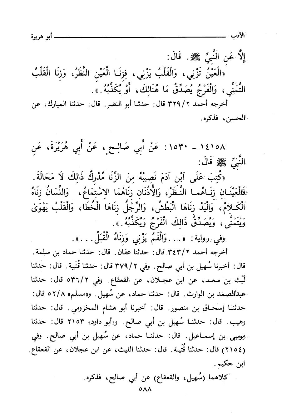 لِكُلِّ بَنِي آدَمَ حَظٌّ مِنَ الزِّنَا، فَالْعَيْنَانِ تَزْنِيَانِ وَزِنَاهُمَا النَّظَرُ، وَالْيَدَانِ تَزْنِيَانِ وَزِنَاهُمَا الْبَطْشُ، وَالرِّجْلَانِ يَزْنِيَانِ وَزِنَاهُمَا الْمَشْيُ، وَالْفَمُ يَزْنِي وَزِنَاهُ الْقُبَلُ، وَالْقَلْبُ يَهْوَى وَيَتَمَنَّى، وَالْفَرْجُ يُصَدِّقُ ذَلِكَ أَوْ يُكَذِّبُهُ.