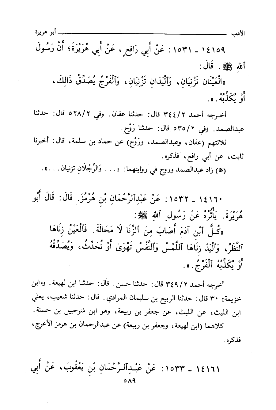 كُلُّ ابْنِ آدَمَ أَصَابَ مِنَ الزِّنَا لا مَحَالَةَ، فَالْعَيْنُ زِنَاؤُهَا النَّظَرُ، وَالْيَدُ زِنَاؤُهَا اللَّمْسُ، وَالنَّفْسُ تَهْوَى أَوْ تُحَدِّثُ، وَيُصَدِّقُهُ أَوْ يُكَذِّبُهُ الْفَرْجُ.