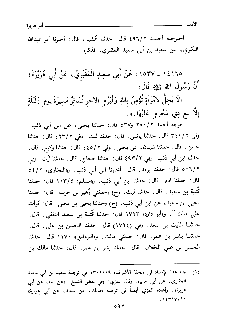 - وفي رواية: لَا تُسَافِرُ امْرَأَةٌ مَسِيرَةَ يَوْمٍ تَامٍّ، إِلَاّ مَعَ ذِي مَحْرَمٍ.