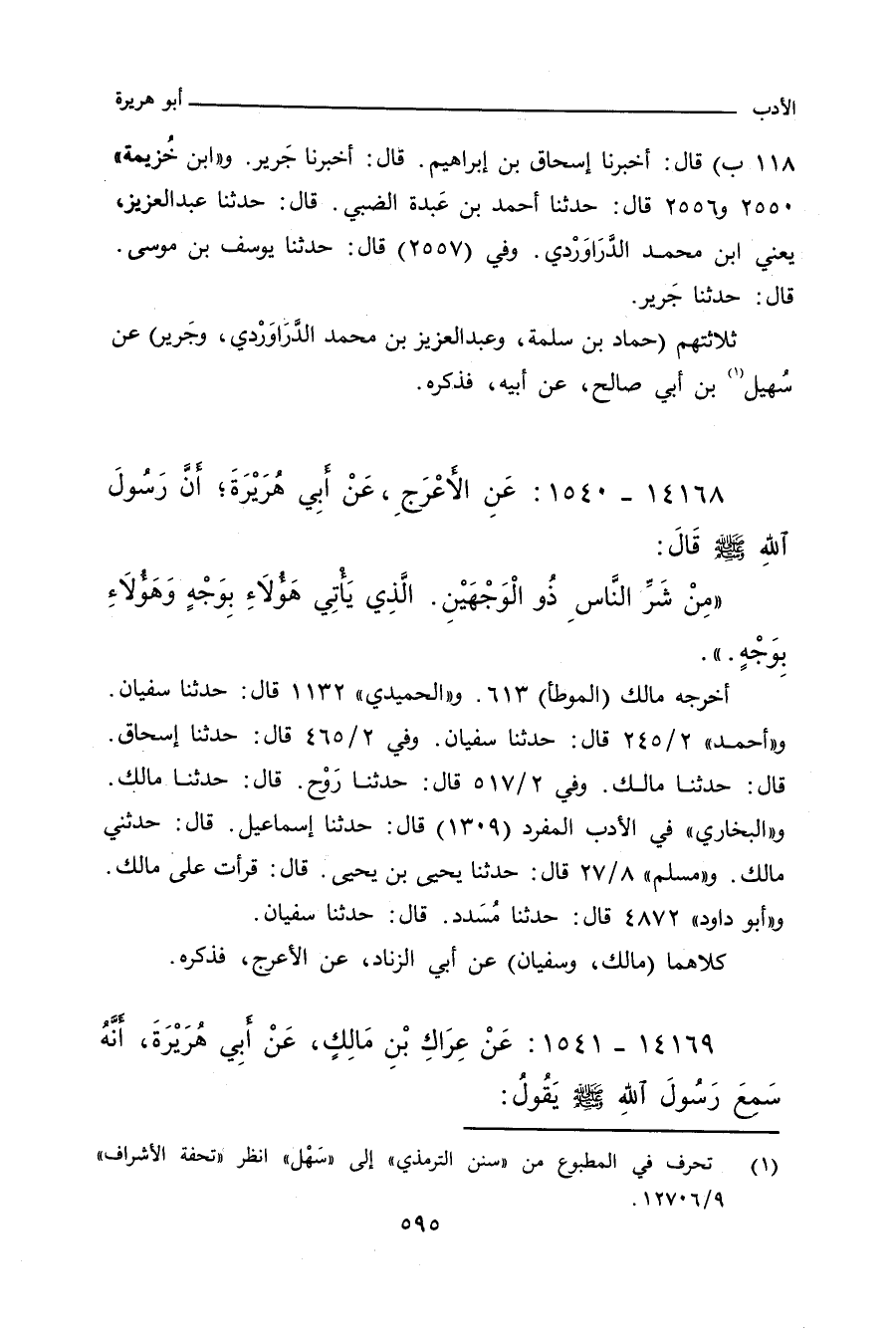 أخرجه مالك ((الموطأ"٢٨٣٤. والحُمَيدي (١١٣٢) قال: حدَّثنا سفيان. و"أحمد" ٢/ ٢٤٥ (٧٣٣٧) قال: حدَّثنا سفيان. وفي ٢/ ٤٦٥ (٩٩٩٨) قال: حدَّثنا إسحاق، قال: حدَّثنا مالك. وفي ٢/ ٥١٧ (١٠٧١١) قال: حدَّثنا رَوْح، حدَّثنا مالك. و"البُخاري" في "الأدب المفرد" ١٣٠٩ قال: حدَّثنا إسماعيل، قال: حدثني مالك. و"مسلم" ٦٧٢٢ قال: حدَّثنا يحيى بن يحيى، قال: قرأتُ على مالك. و"أبو داود" ٤٨٧٢ قال: حدَّثنا مُسَدد، حدَّثنا سفيان. و"أبو يَعْلَى" ٦٢٦٥ قال: حدَّثنا أبو خيثمة، حدثنا سفيان. و"ابن حِبَّان" ٥٧٥٥ قال: أخبرنا عمر بن سعيد بن سنان، قال: أخبرنا أحمد بن أبي بكر، عن مالك.